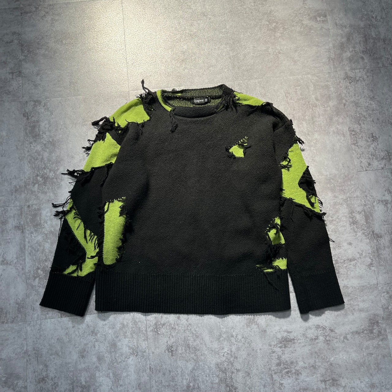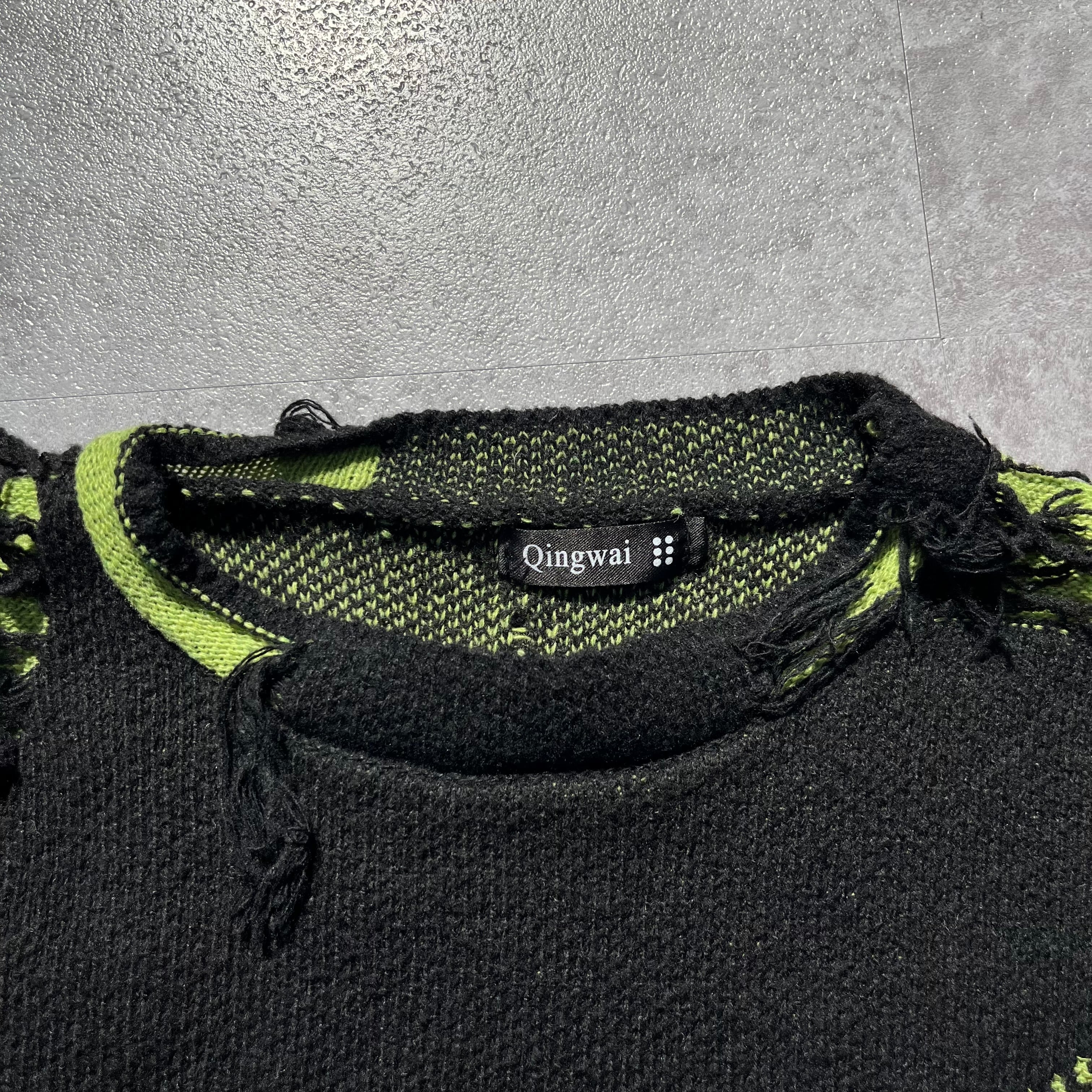 黒×ライムグリーンのバイカラーに、大胆なほつれと裂け目が走るインパクト大のセーター。“デザインとしての破壊”は、裏地のグリーンがちらりとのぞくたびに、アナーキーなムードが際立ちます。どこから見ても視線をさらう、攻めた表情のニットです。