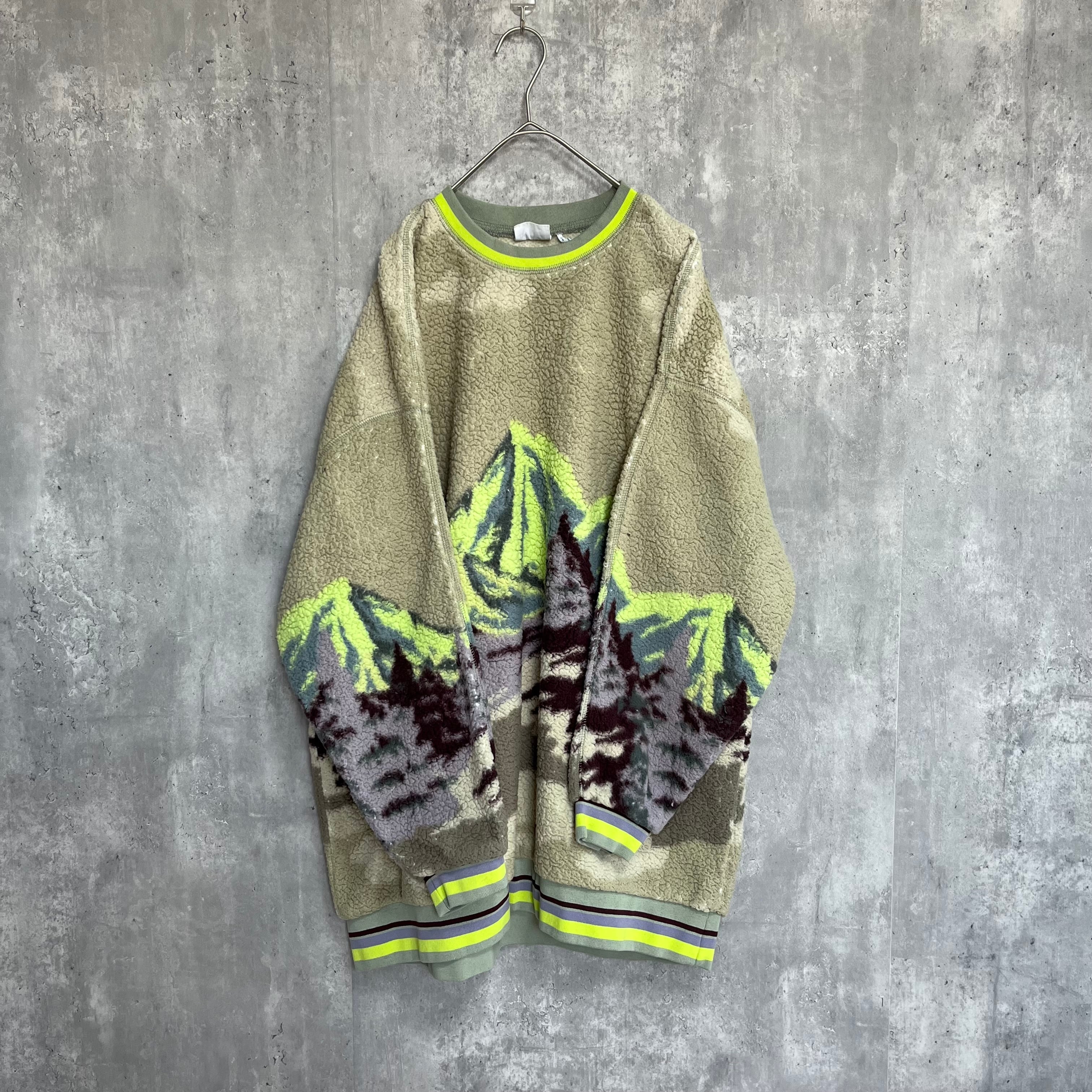 山の稜線をそのまま切り取ったようなグラデーションのボアが目を引く一枚。ベースは素朴なベージュトーンなのに、稜線のライムグリーンが光を受けた雪山みたいに鮮やかで、まるで景色を着る感覚です。袖口と裾のラインリブがさりげなくスポーティーさを添えてくれるのもいい。