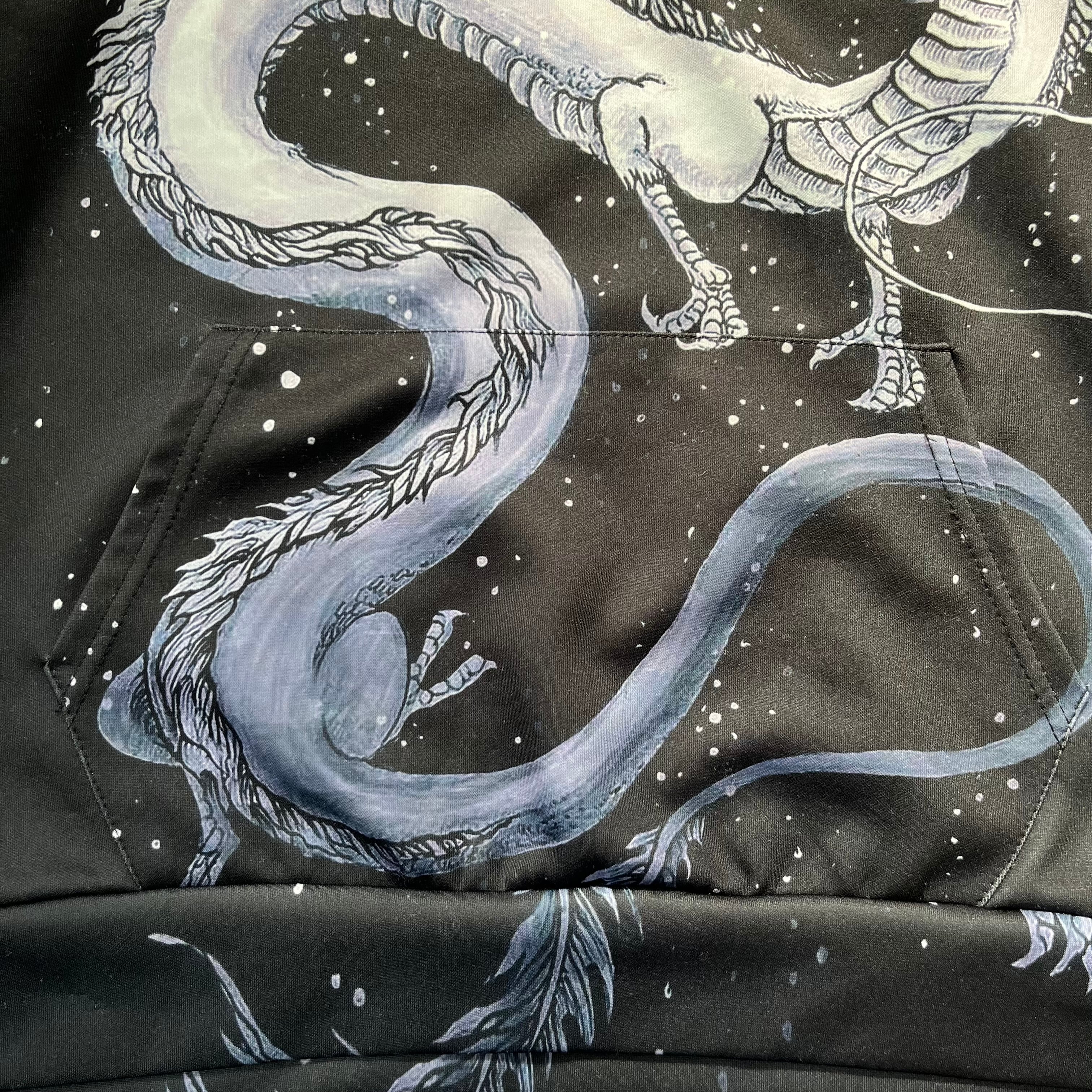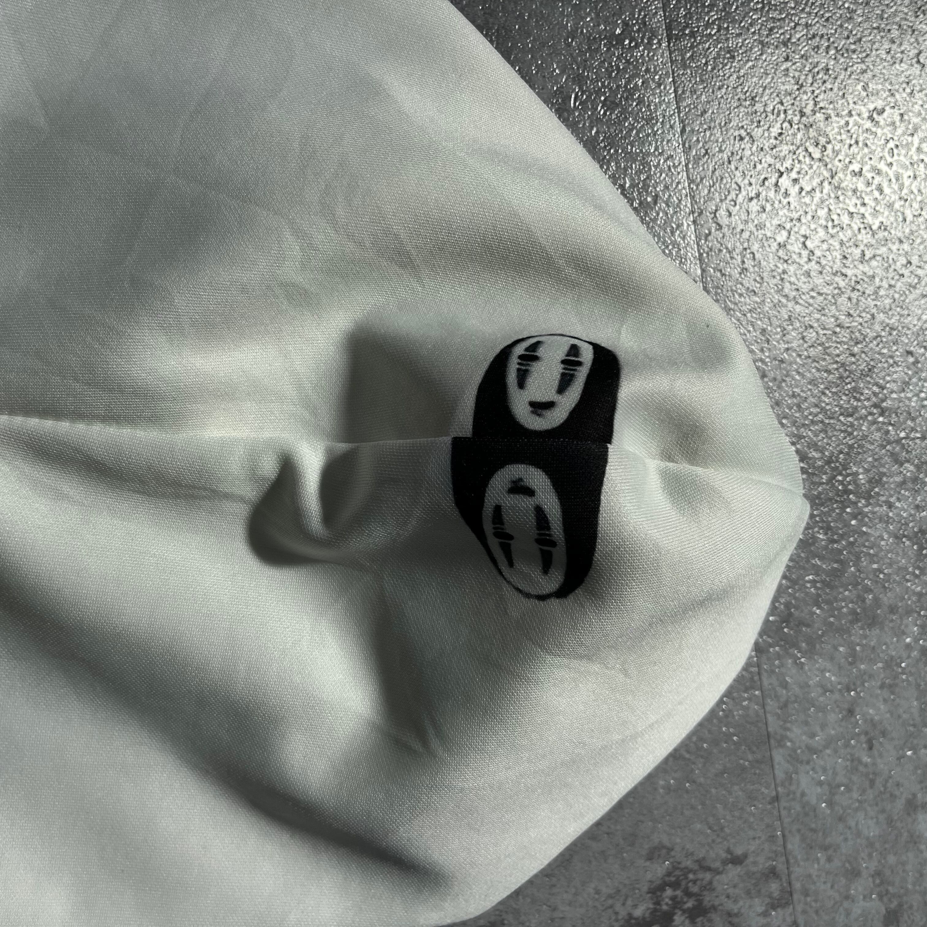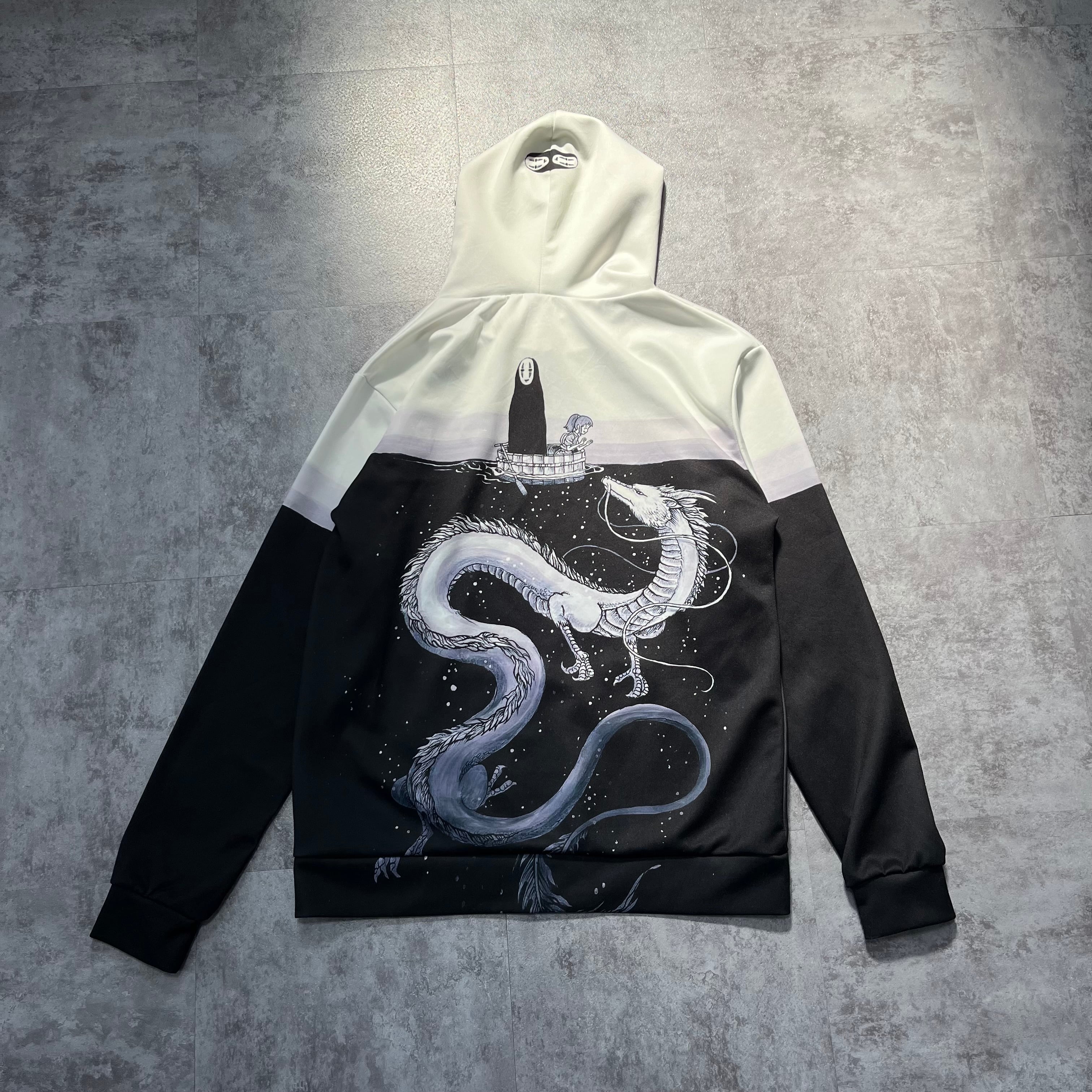 夜空を切り裂くように泳ぐ白き龍、ニギハヤミコハクヌシ。その上の小さなイカダには、無表情のカオナシとちょこんと座る千尋。淡いグラデーションの空と水面がひと続きになったプリントは、まるで映画のワンシーンをそのまま切り取ったよう。黒とオフホワイトの配色が物語の余韻を引き立てます。