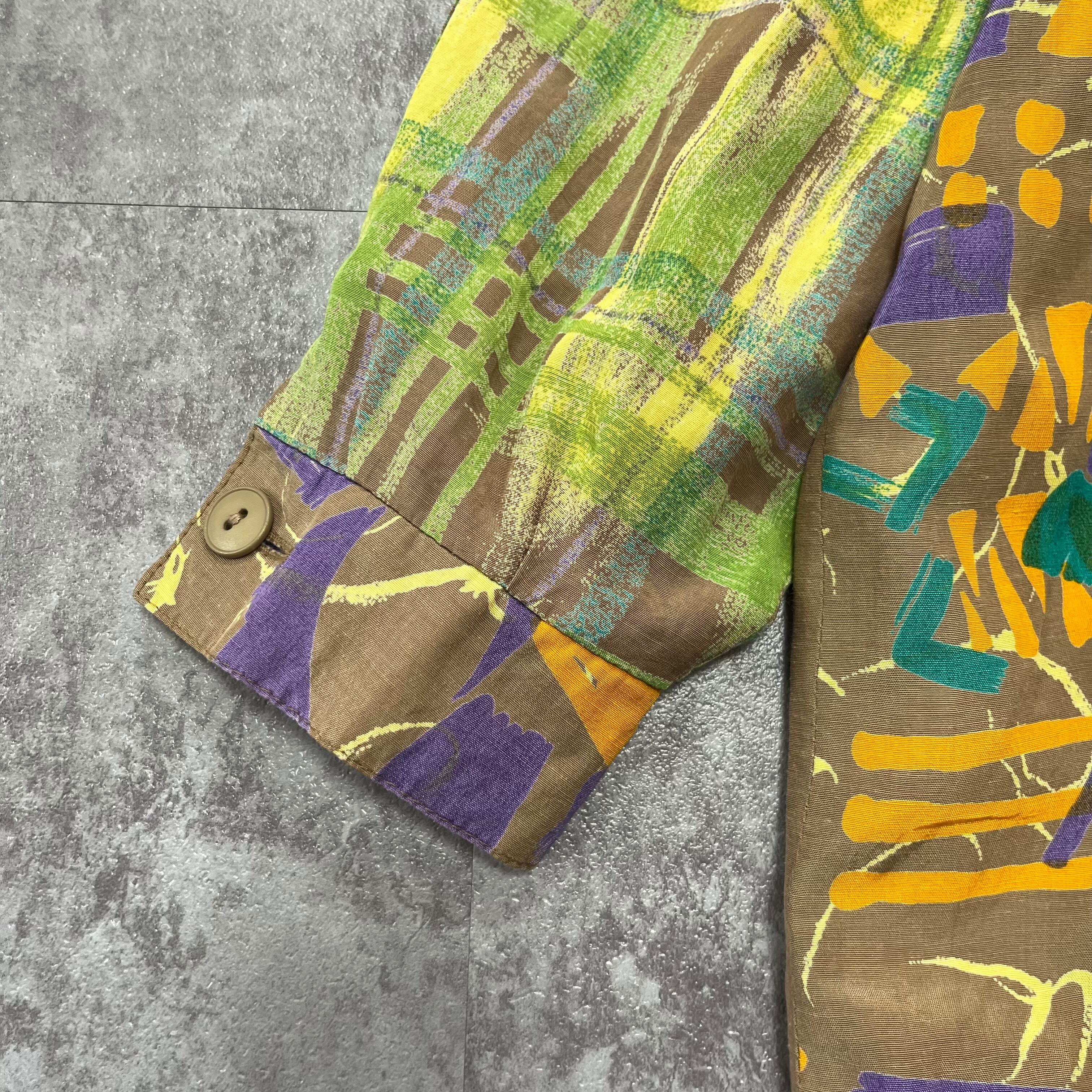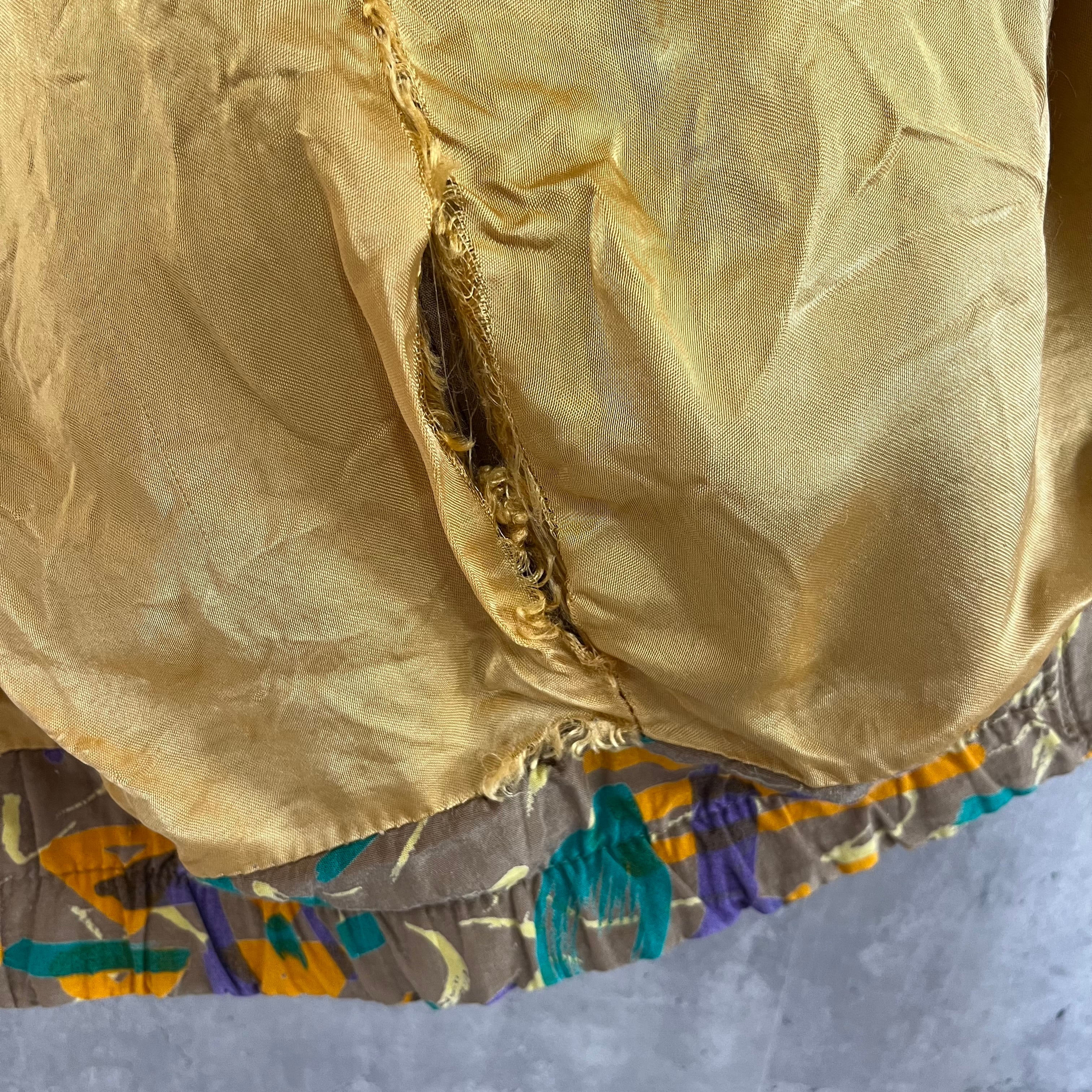 カーキベースにパープルやマスタード、グリーンを重ねた抽象柄が、まるで80’sのアートポスターのような存在感。フロントはシンプルに見えて、切り替えパネルがシャープなV字を描き、肩から袖にかけてのパターンが動きを出しています。裏地のゴールドサテンも相まって、羽織ると一気にヴィンテージムードが立ち上がる一着です。