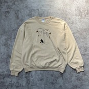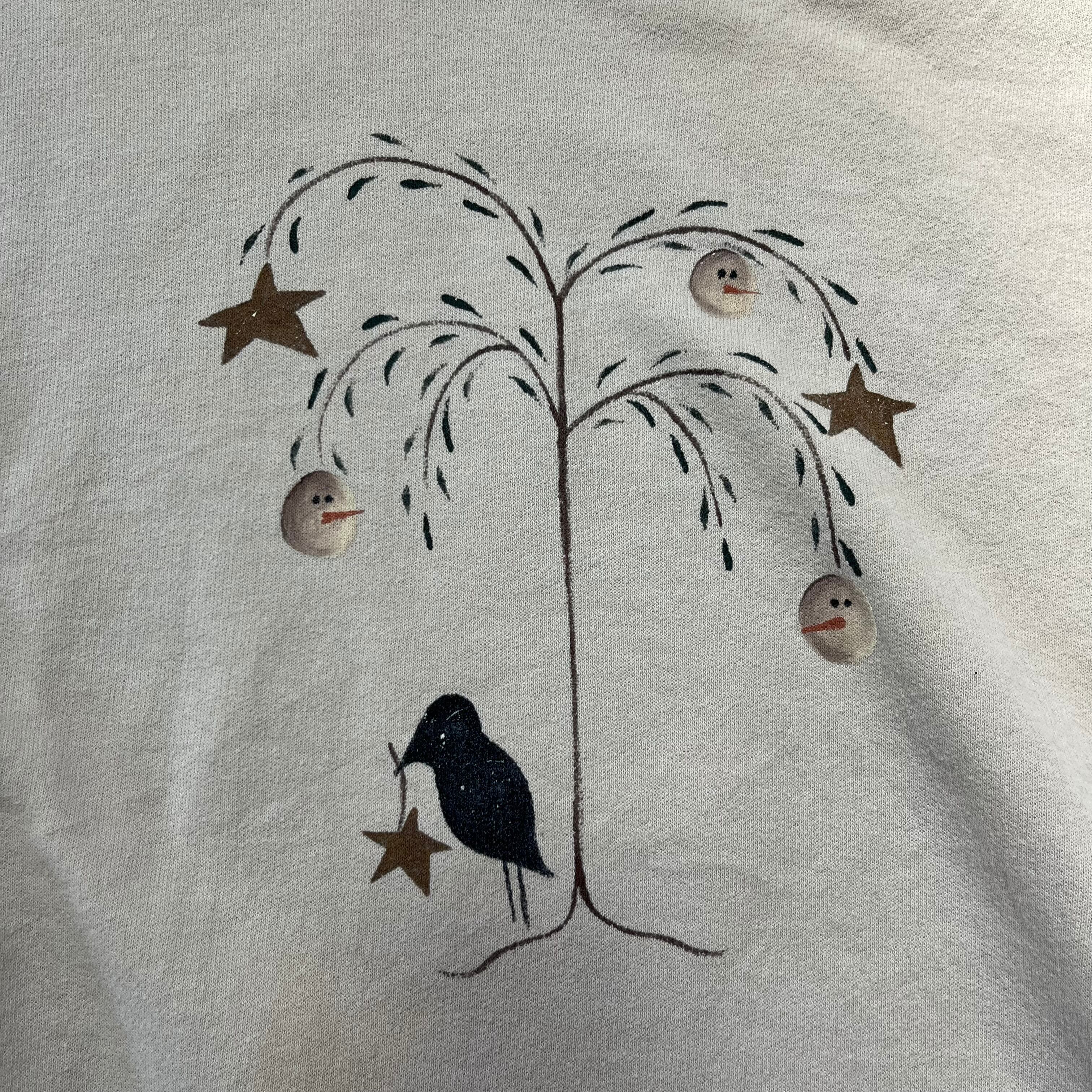 やわらかなベージュ地に、柳のようにしなった枝から星と雪だるまが下がる幻想的なプリント。枝先のきらりとしたゴールドが、まるで冬の森の夜空を切り取ったようなムードを添えています。フロントの足元にちょこんと立つ黒い鳥が、シンプルなスウェットを物語のワンシーンに変えてくれるアクセント。