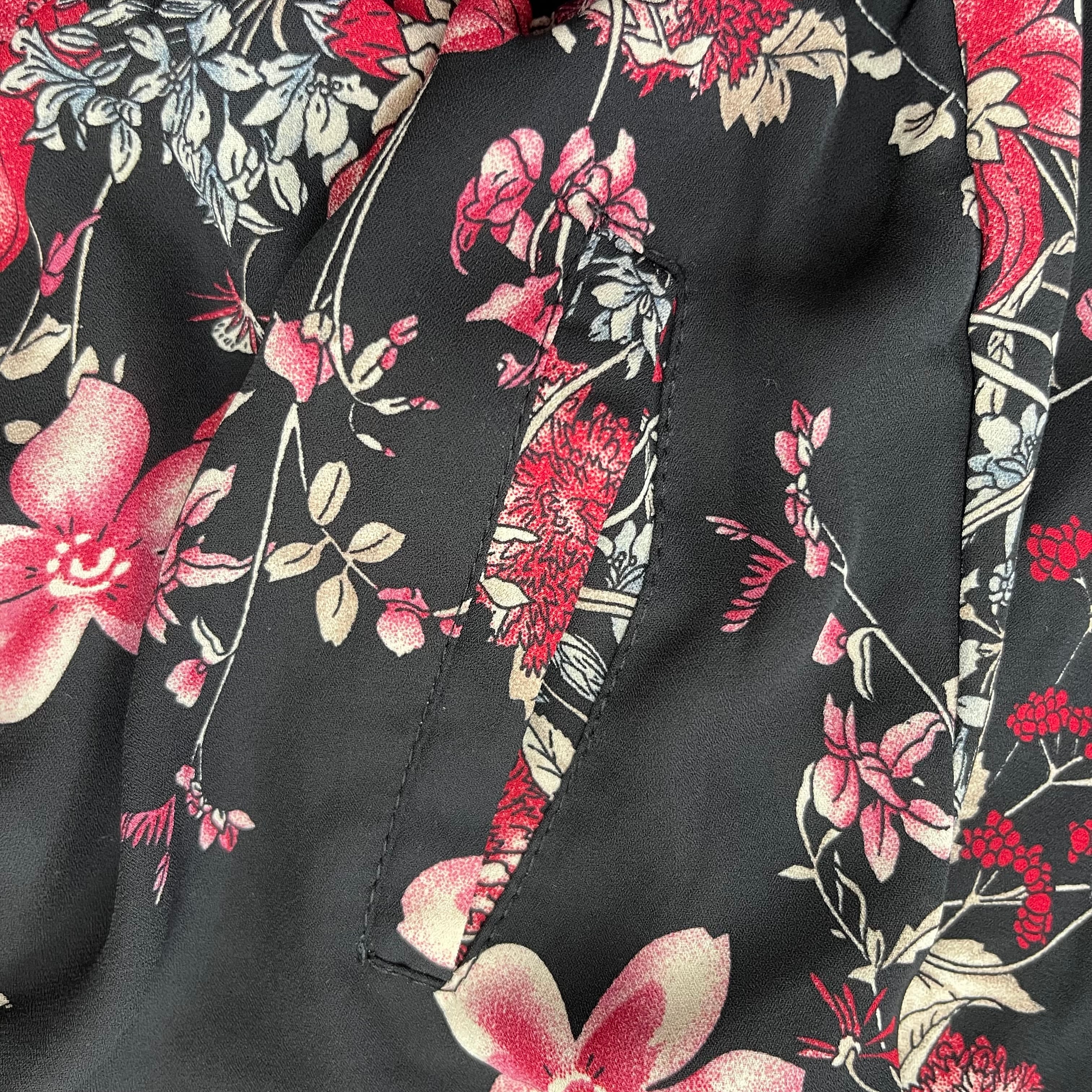 艶やかな黒地に映える深紅の花々。夜の庭をそのまま羽織ったようなジャケットは、動くたびに柄が浮き立つ繊細なプリントが魅力です。控えめな光沢があり、ジップを閉めればクールに、開ければ軽やかに雰囲気を変えられるのもポイント。