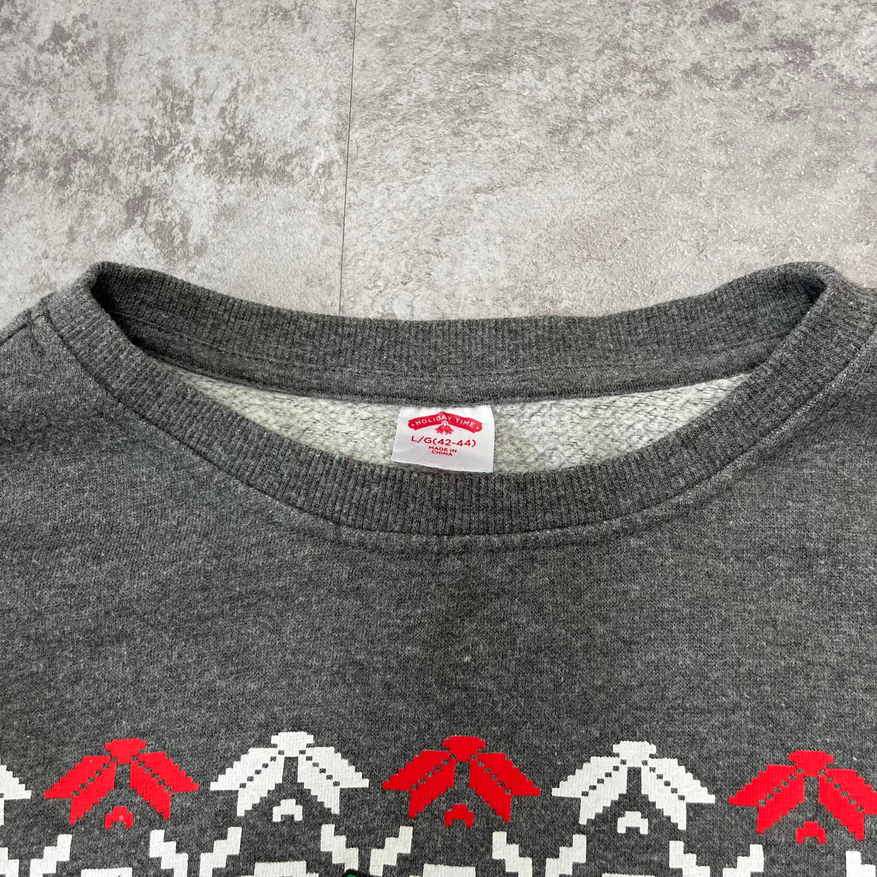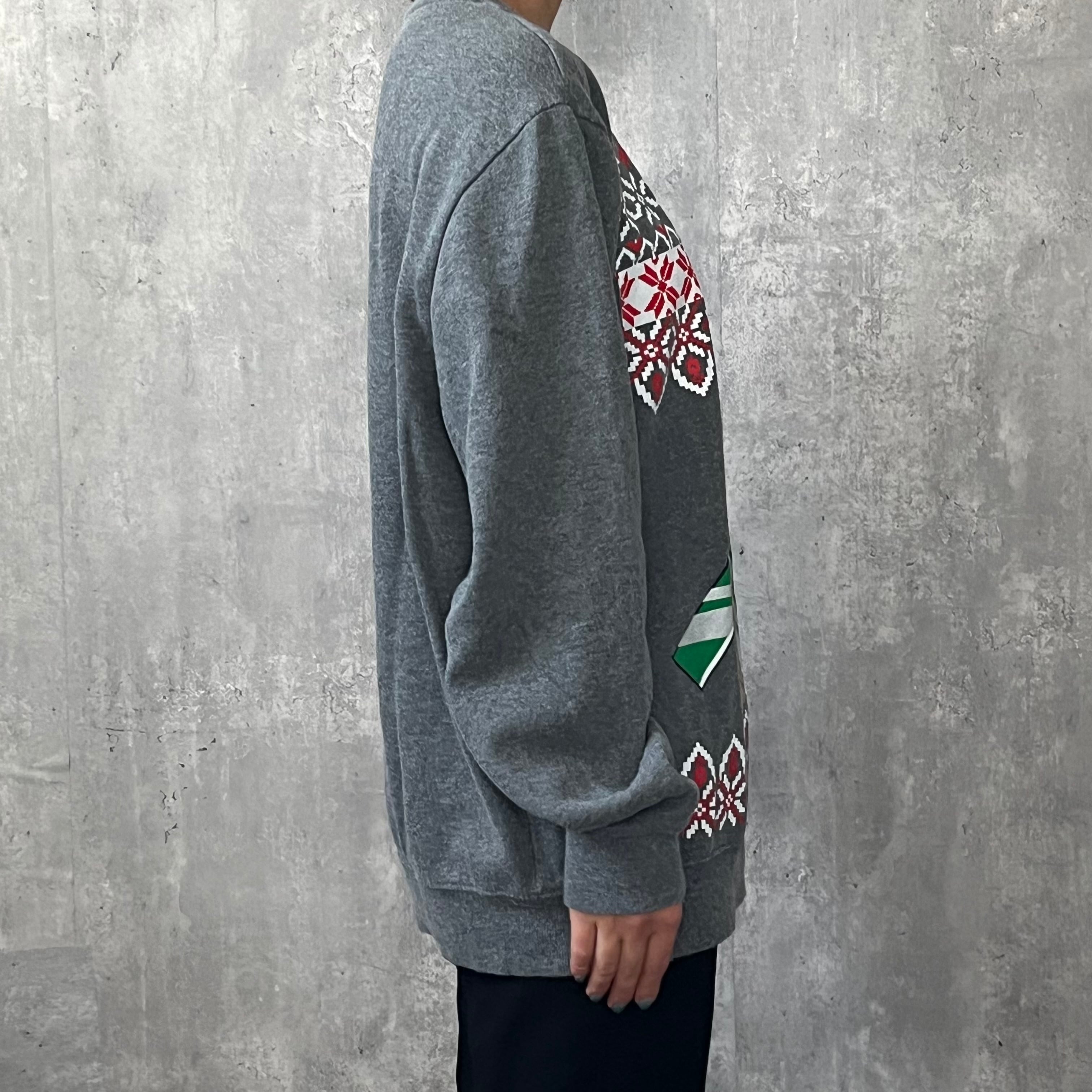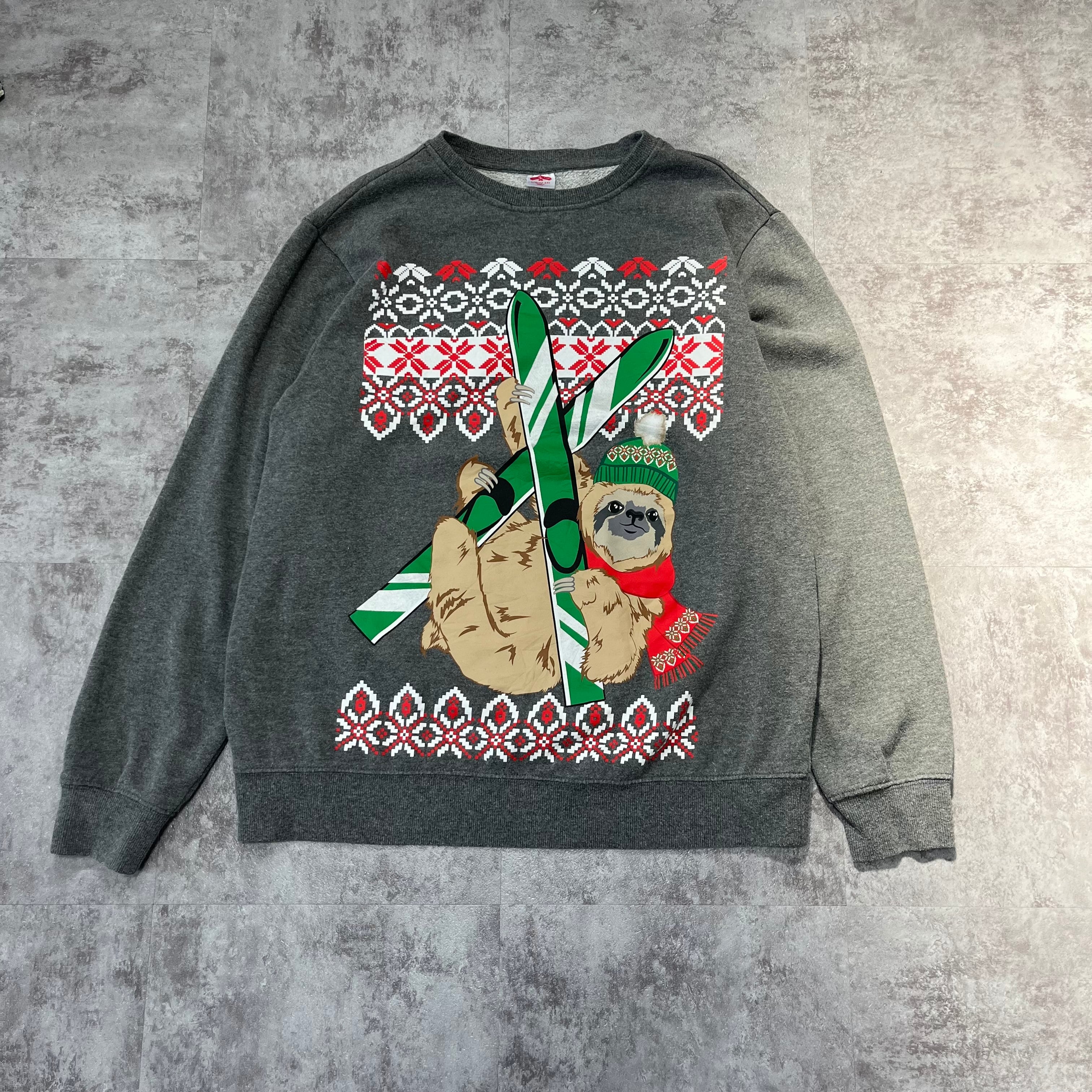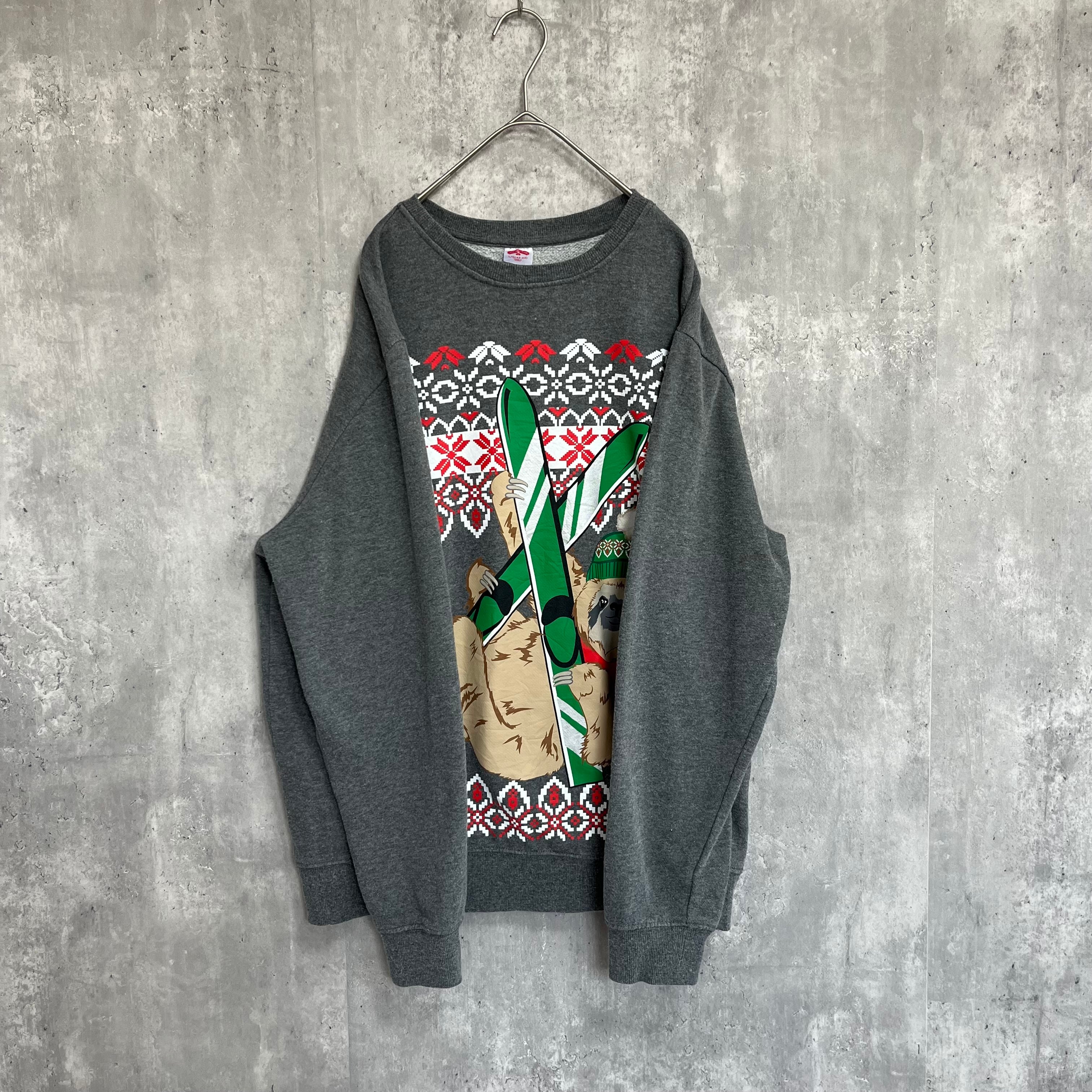 チャコールグレーのボディが柄のポップさをほどよく落ち着かせ、コーデの主役にちょうどいい存在感。状態も良く、デイリーに楽しめます。ホワイトのワイドパンツで冬らしくクリーンにまとめたり、カーキのカーゴパンツでアウトドア気分を添えても◎。着るだけでホリデー気分と笑いを連れてくる頼れるスウェットです。