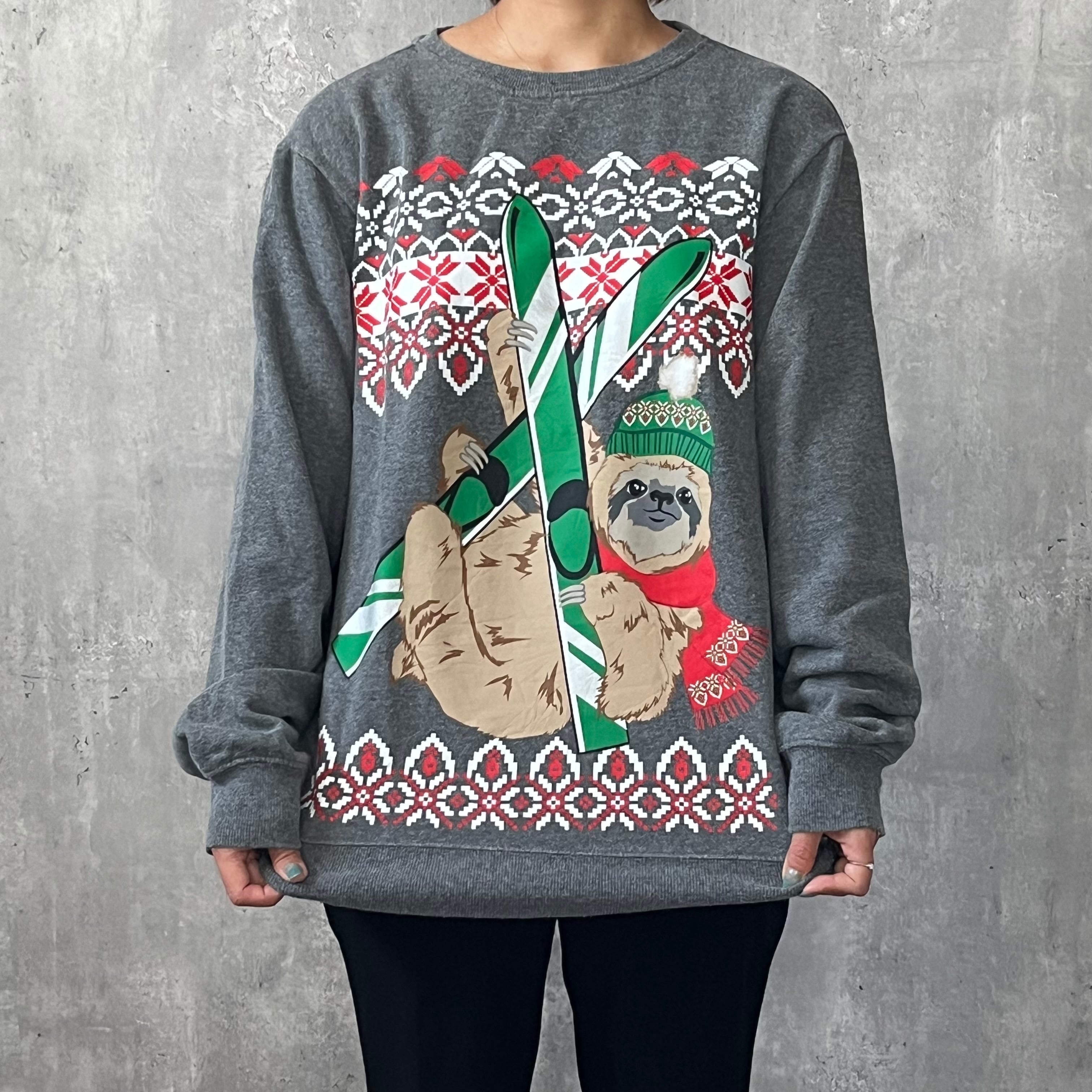 フェアアイル柄のニット風プリントに、どこかドヤ顔のナマケモノがスキー板を抱えて登場。赤いマフラーとポンポン付きのニット帽までしっかり装備しているのに、どう見ても滑る気はなさそう──この脱力感がたまらない一枚です。