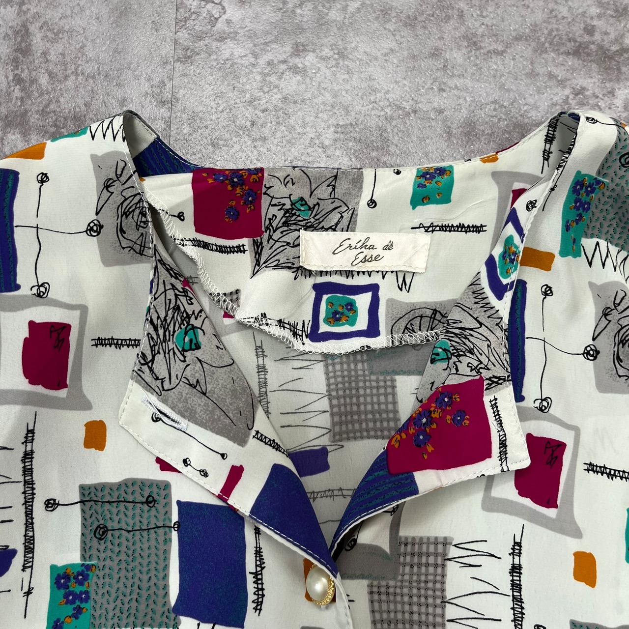 まるでジャズの即興演奏みたいに、四角や線、手描きのスケッチが軽やかに散りばめられたブラウス。オフホワイトをベースに、深いブルーやチェリーレッド、からし色の差し色が効いていて、80’sらしいグラフィカルなムードをまとっています。