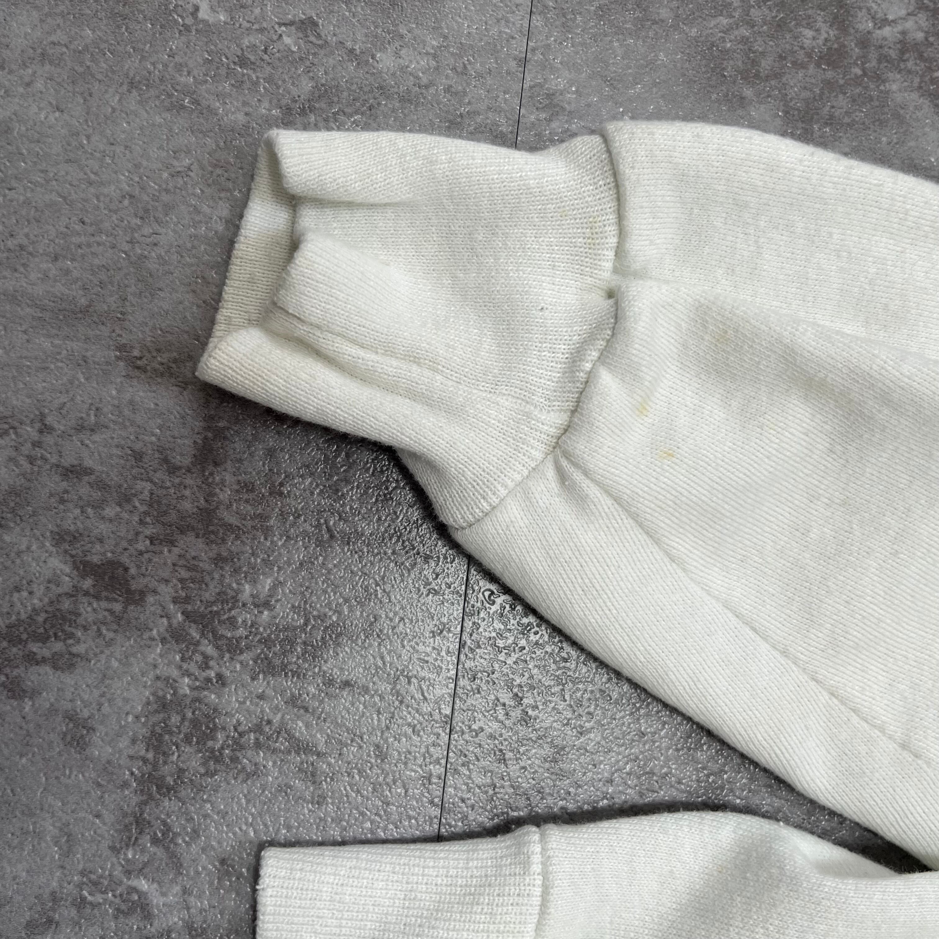 白地に描かれた、春の訪れを告げるような小鳥とアザミのプリント。淡いトーンの中にピンクとイエローがぱっと映えて、まるで古い絵本のワンページを切り取ったよう。シミも、このスウェットが過ごしてきた時間の証みたいで、むしろ雰囲気を深めています。