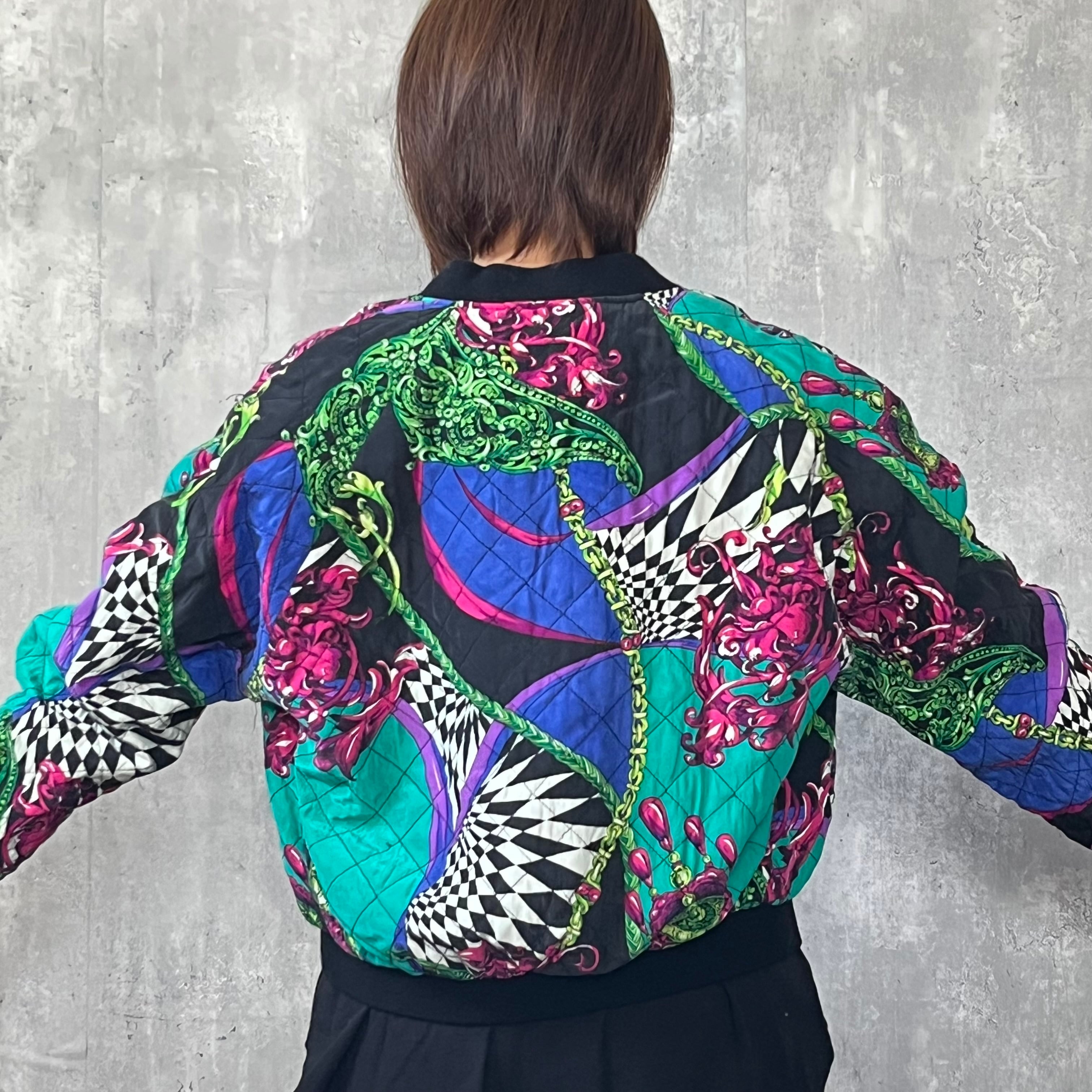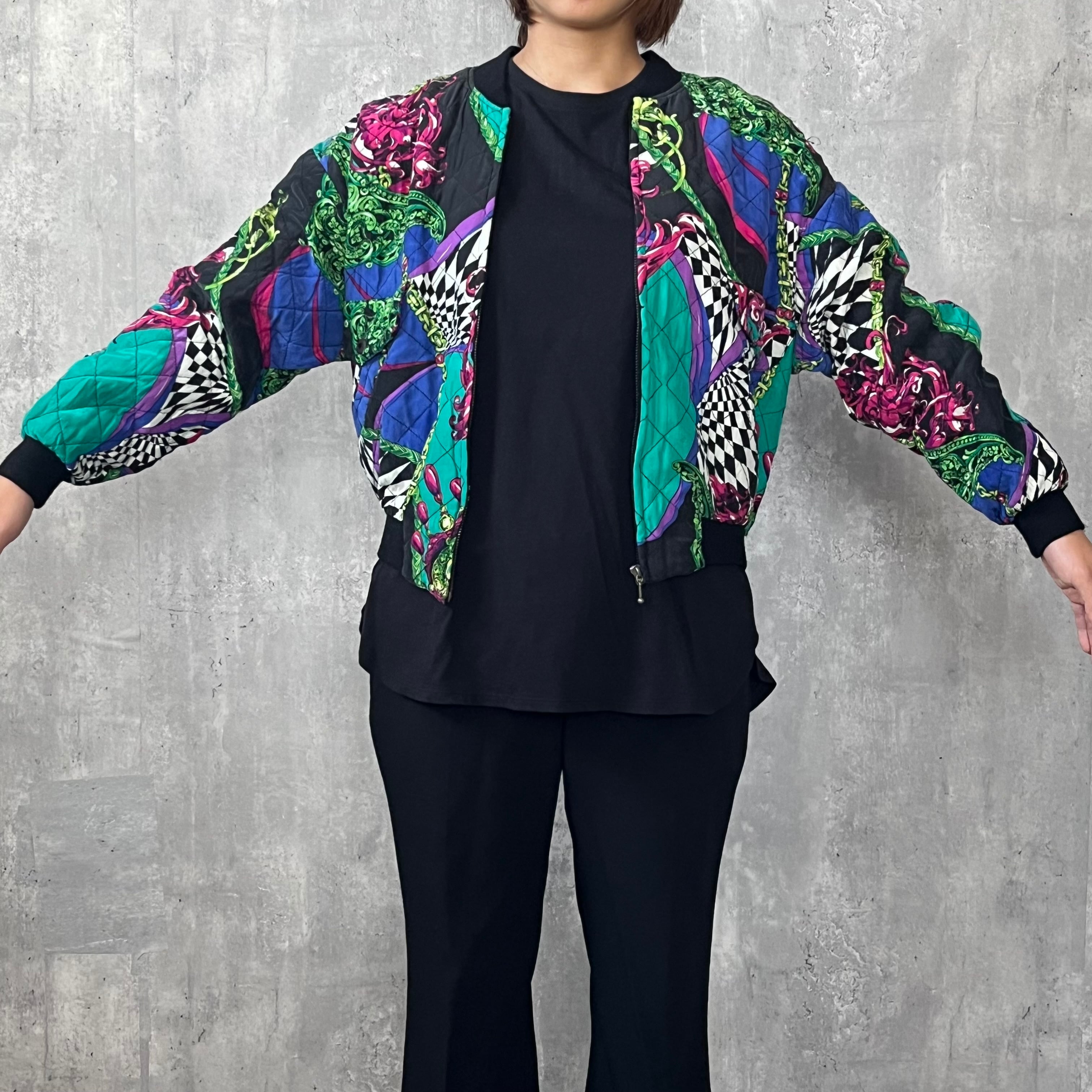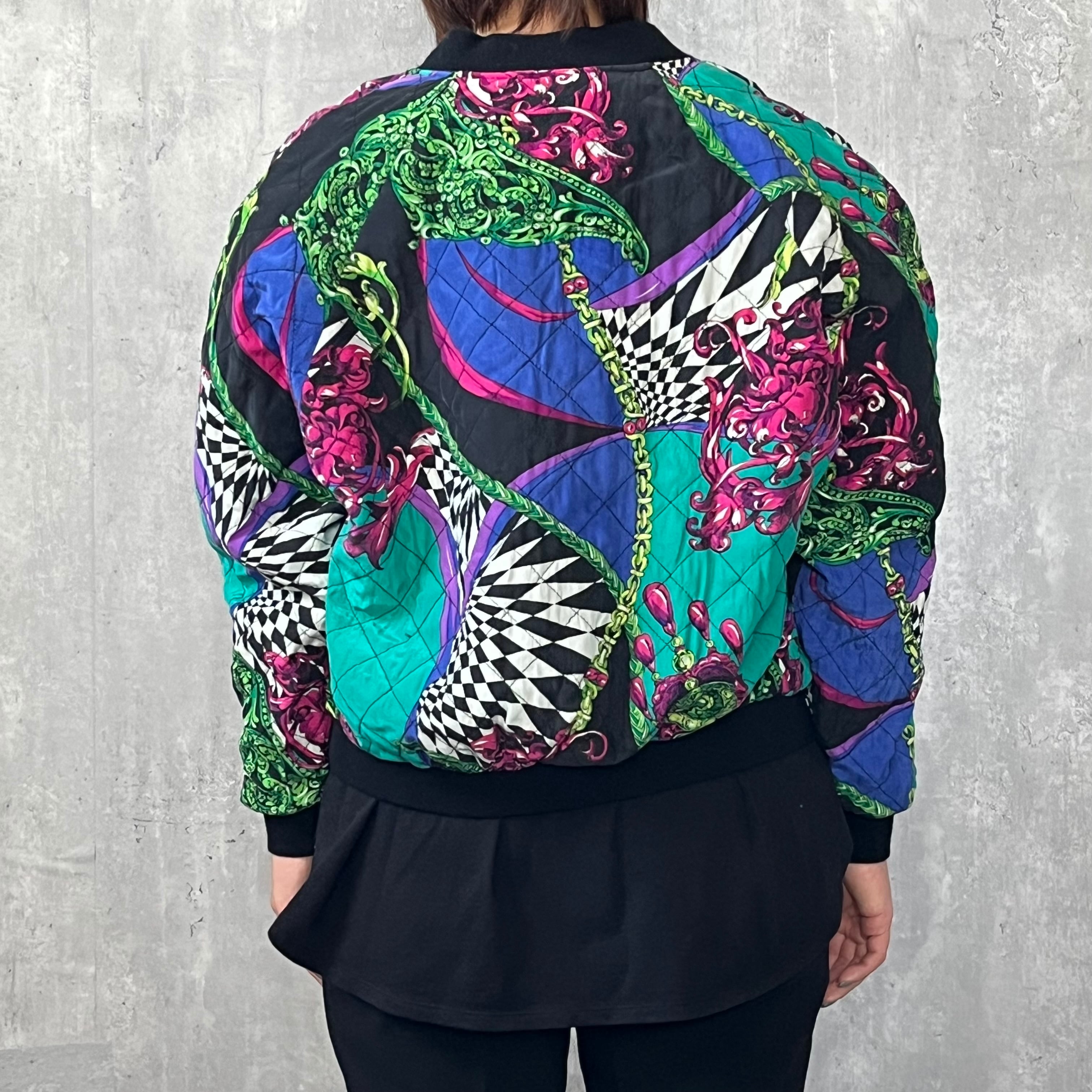 まさに80’sの熱気を閉じ込めたようなキルティングブルゾン。ビビッドなマゼンタやライムグリーンが黒とターコイズにぶつかり合い、チェッカーフラッグ柄がリズムを刻む──まるで狂気じみたパレットの中で踊るような一着です。キルティングの程よいボリューム感が、柄のインパクトを引き立てています。