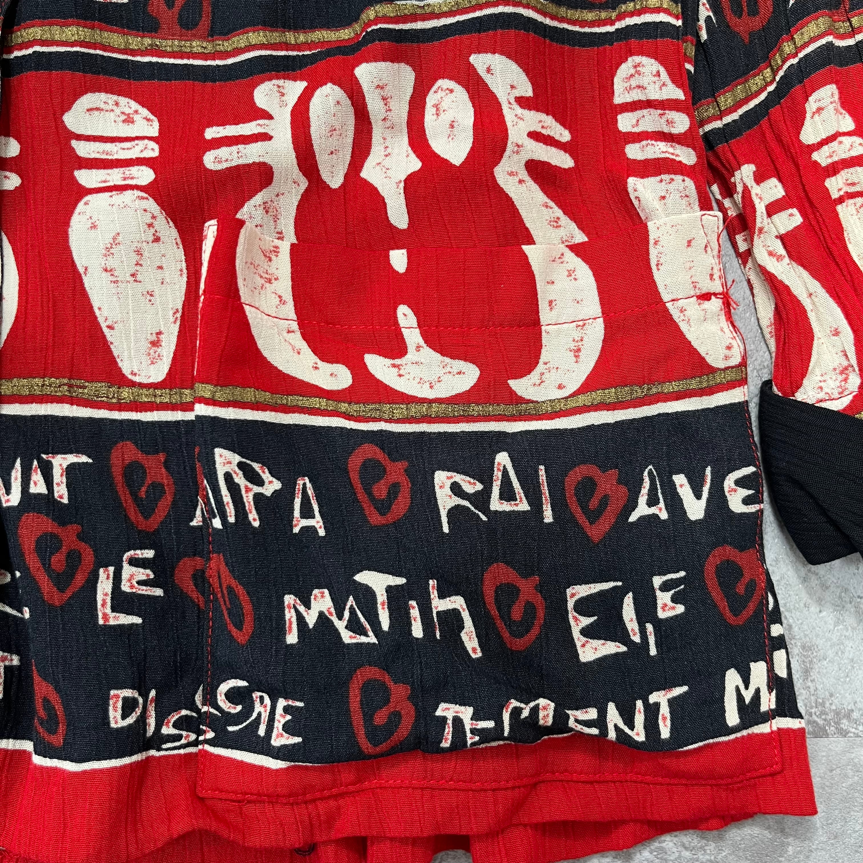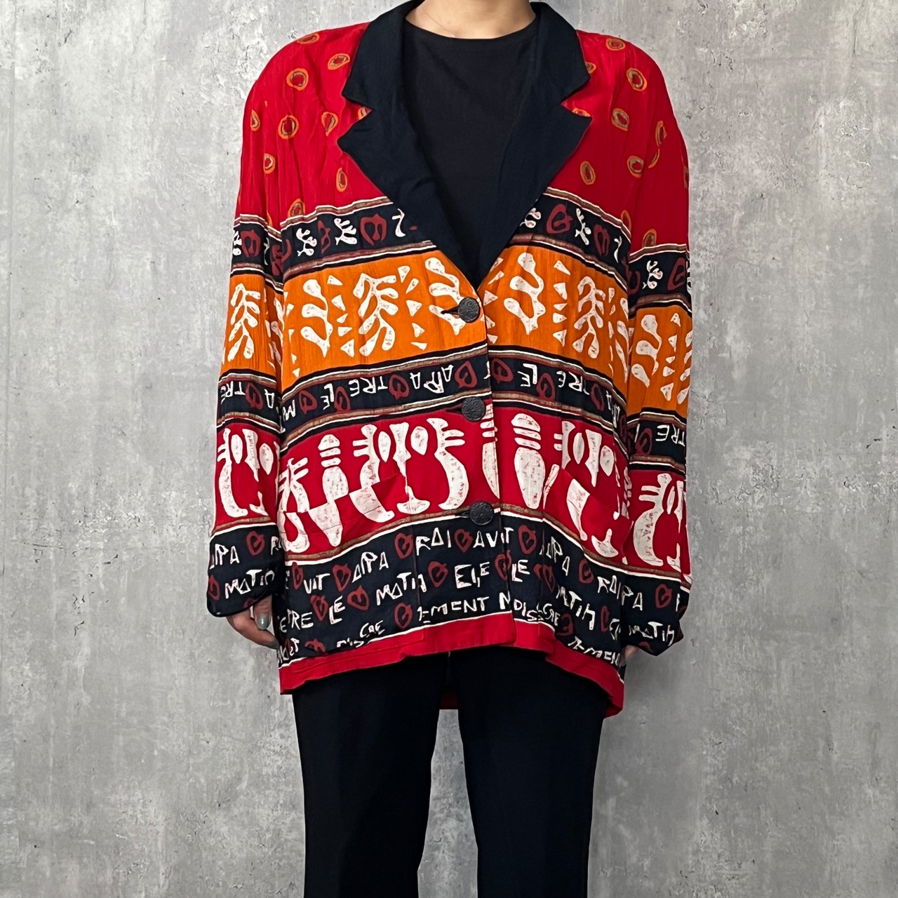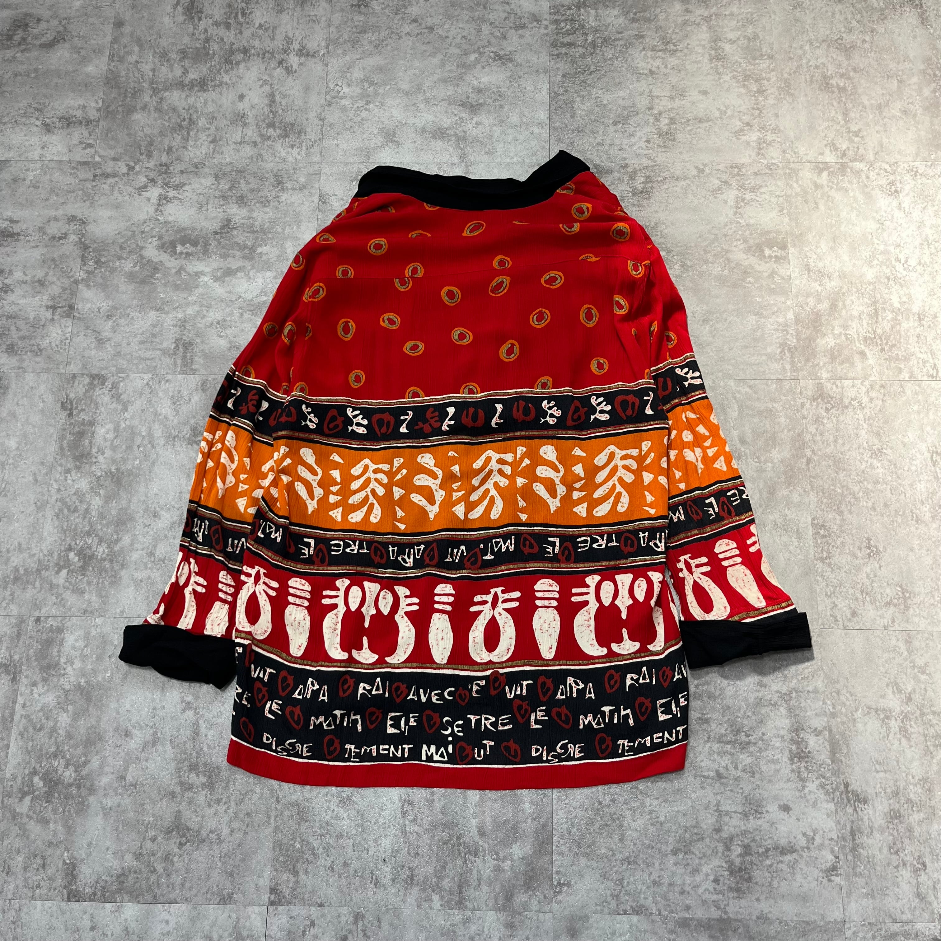 赤・オレンジ・黒の切り替えに、民族調のモチーフや文字が踊るヴィンテージジャケット。