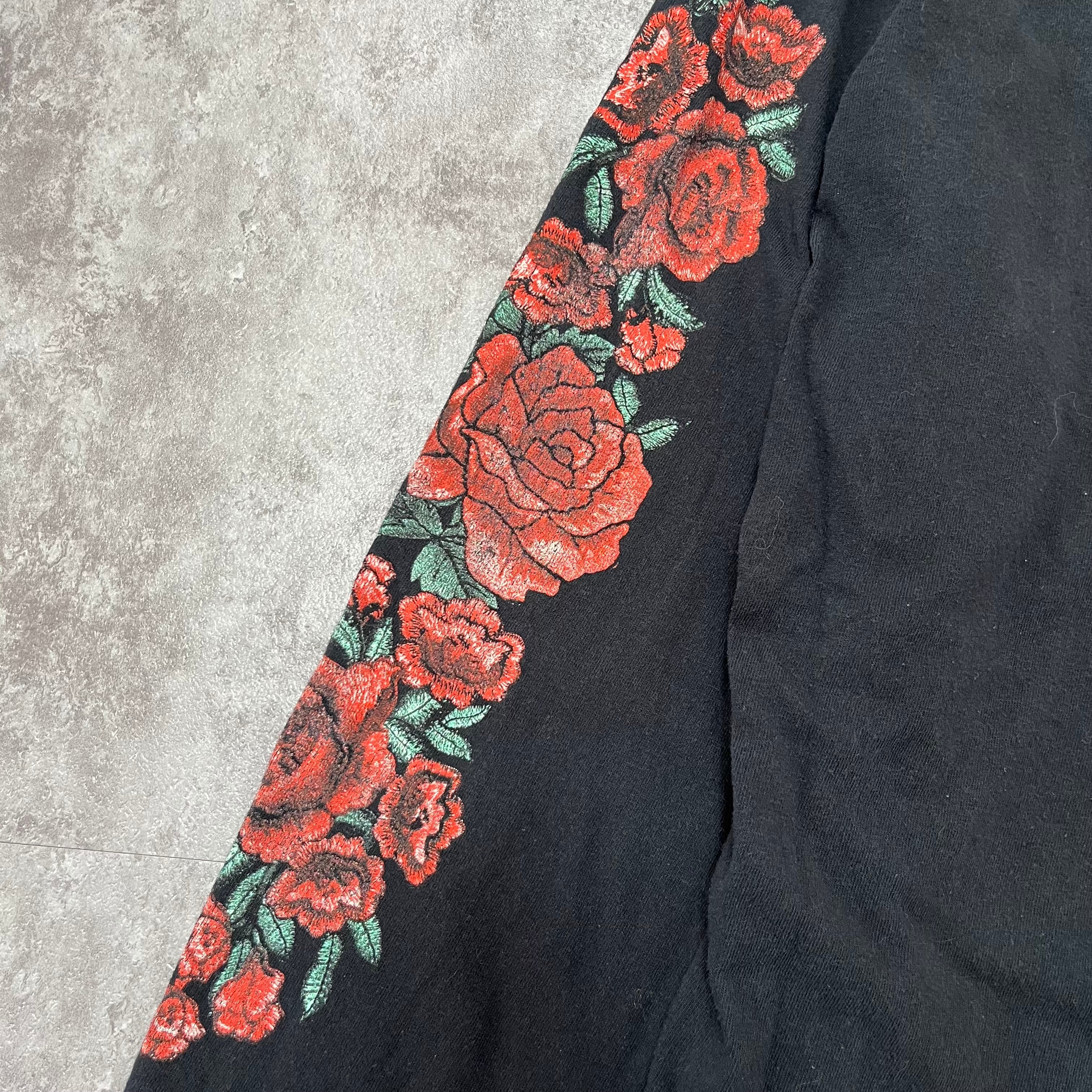 闇に浮かぶ赤い薔薇が印象的なロングスリーブTシャツ。胸元には控えめに薔薇とロゴが添えられ、両袖には燃えるような赤薔薇の刺繍が大胆に走るデザイン。黒地の生地に映える深紅の花が、どこか孤高でロマンティックなムードを醸し出します。