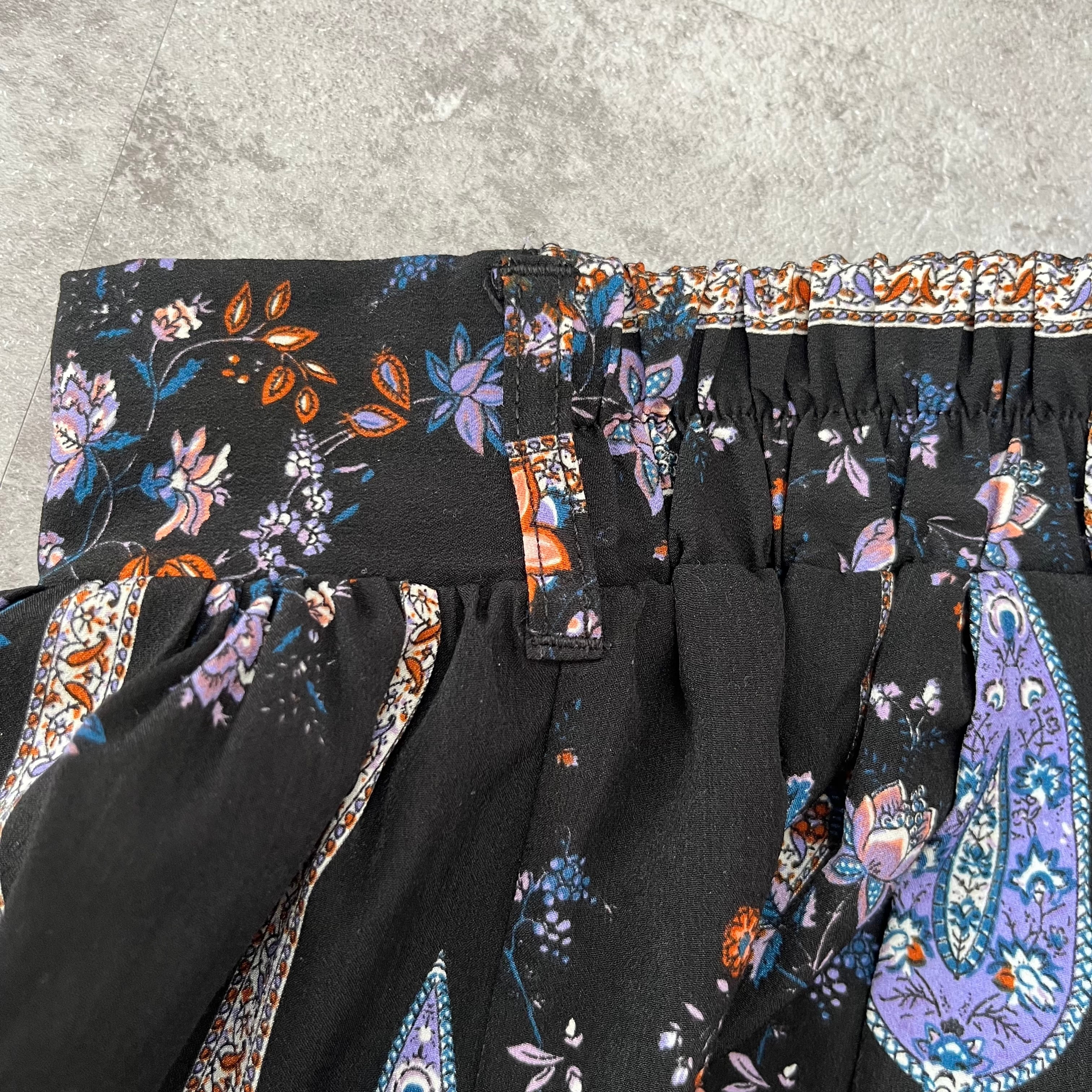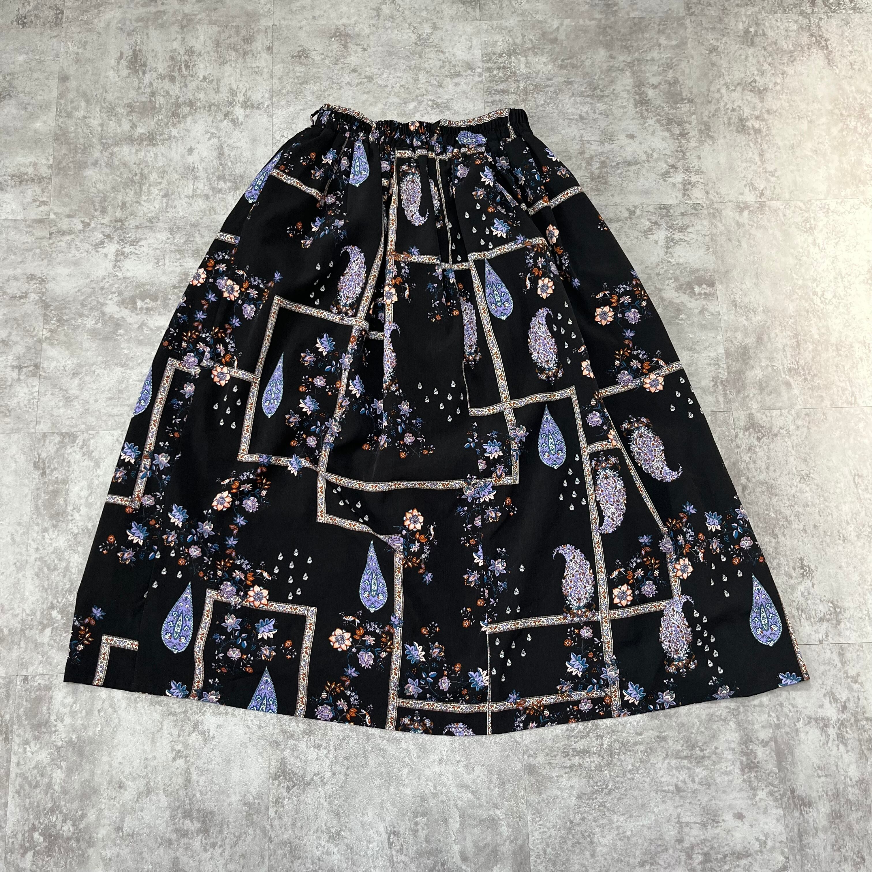 夜空を閉じ込めたような黒地に、ペイズリーと小花が星屑のように散りばめられたフレアスカート。動くたびに柄がふわりと流れ、まるで夜風に揺れる星の軌跡を描くよう。上品さと個性が同居した、古着らしい一点ものの存在感です。