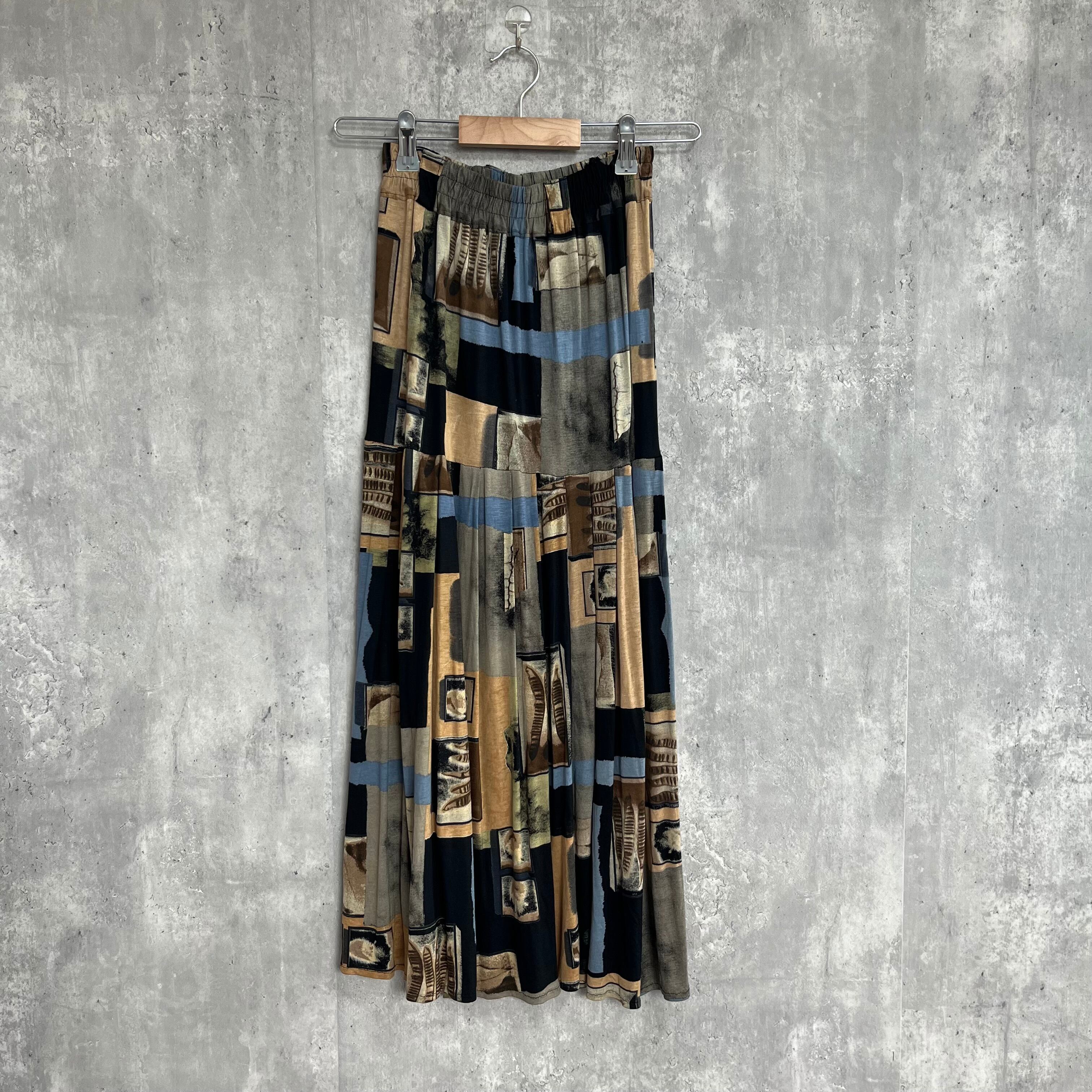 異素材が交錯するような、アート感あふれるジオメトリースカート。ベージュやカーキ、グレー、ブラックのニュアンスカラーが絶妙に重なり合い、まるで抽象画の一部を切り取ったようなデザイン。落ち着いた色味ながらも奥行きがあり、どの角度から見ても印象が変わる一本です。