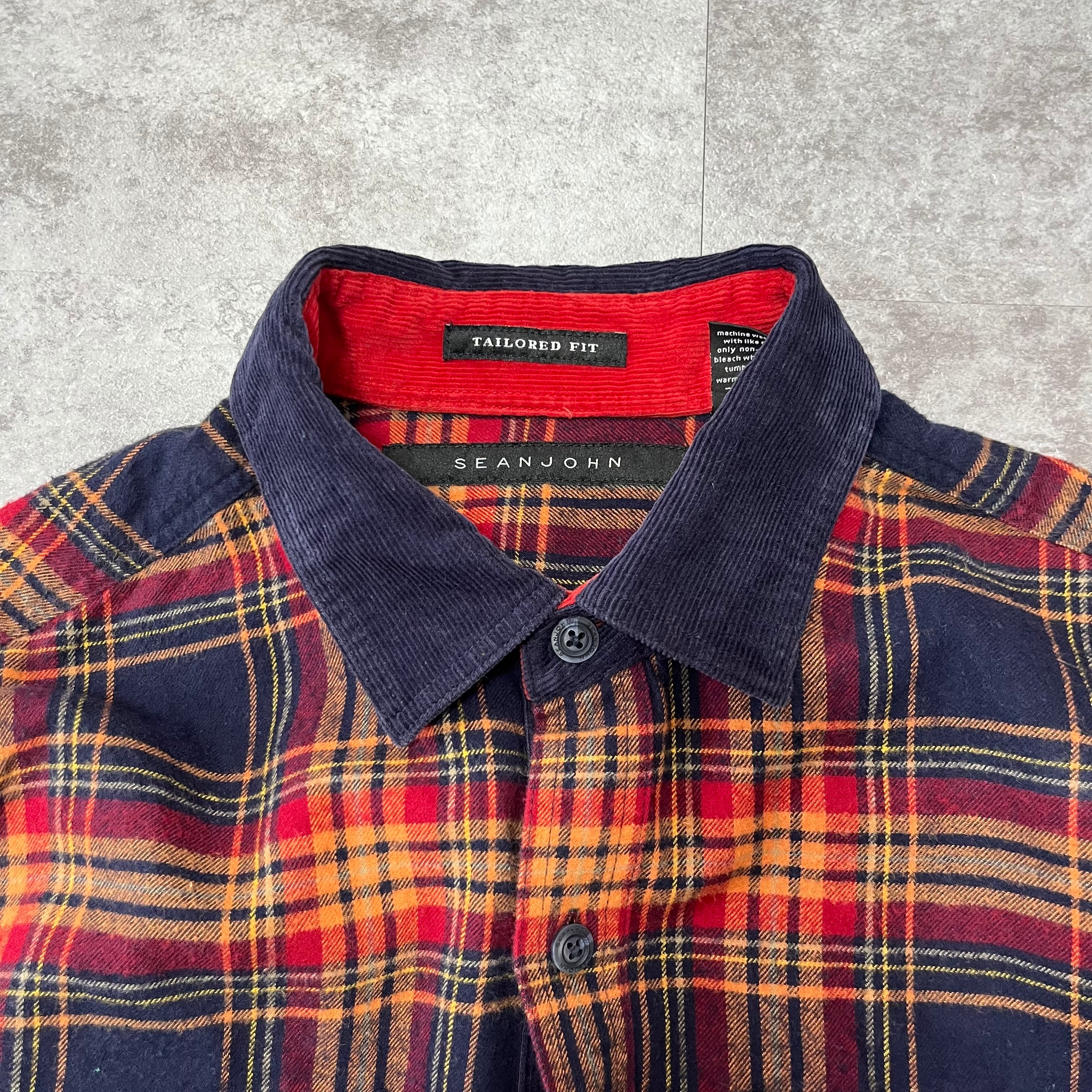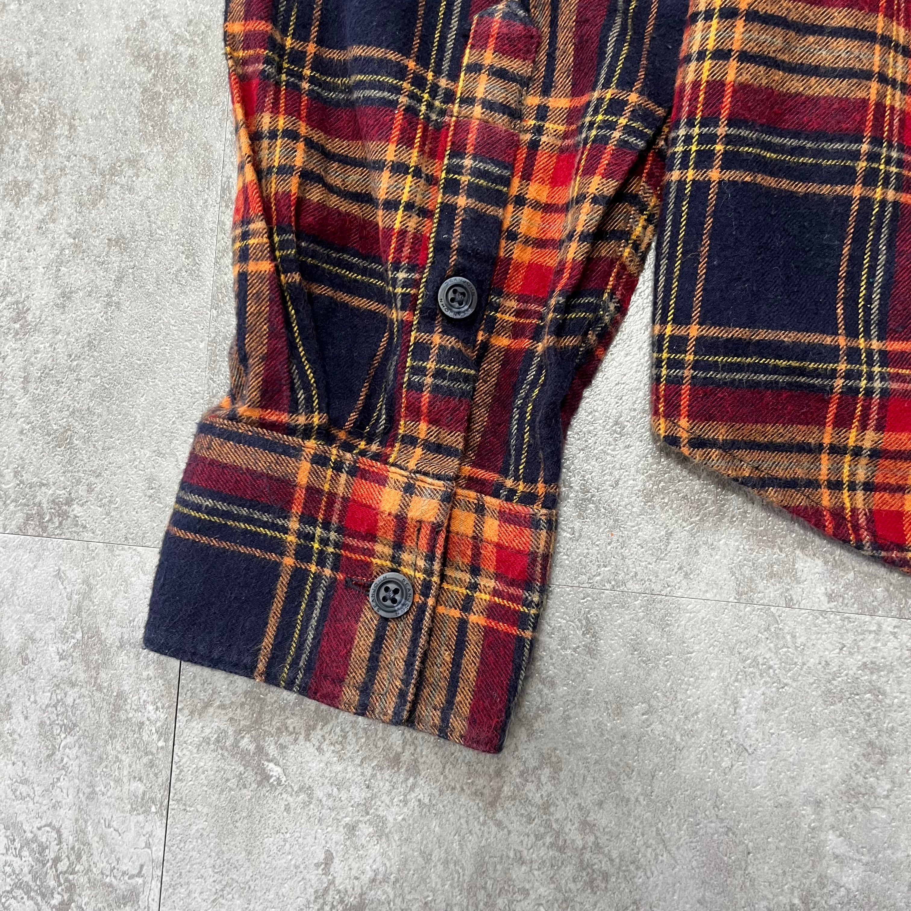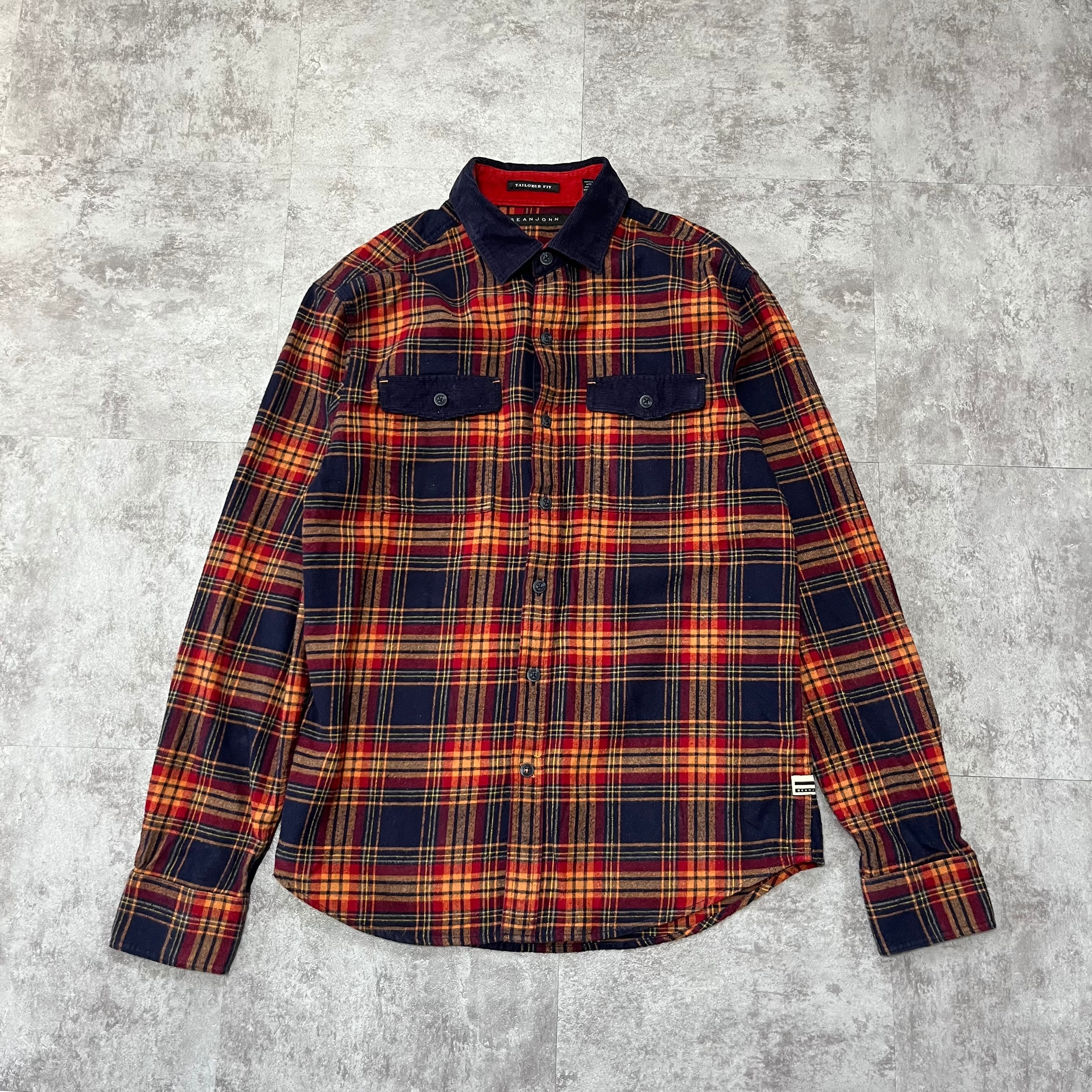 深みのあるネイビーをベースに、赤とイエローが絶妙に混ざり合ったタータンチェックシャツ。どこか英国調の上品さを漂わせながらも、肘のコーデュロイパッチが遊び心を添えています。