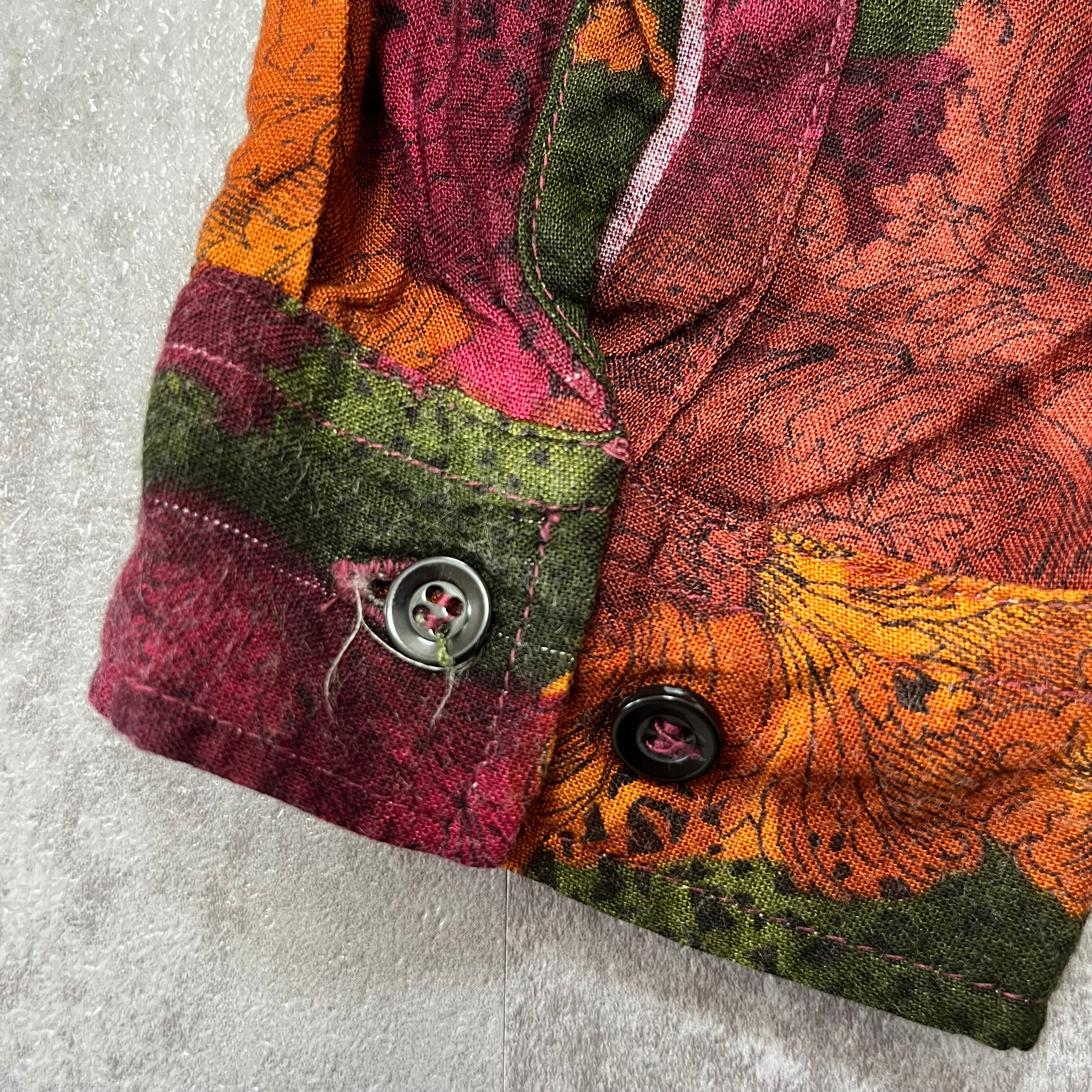深みのあるワインレッドを基調に、オレンジとグリーンが織り交ざった花柄が印象的なヴィンテージ調シャツ。どこかアートピースのような存在感で、まるで秋の絵画をそのまま身にまとうような一枚です。