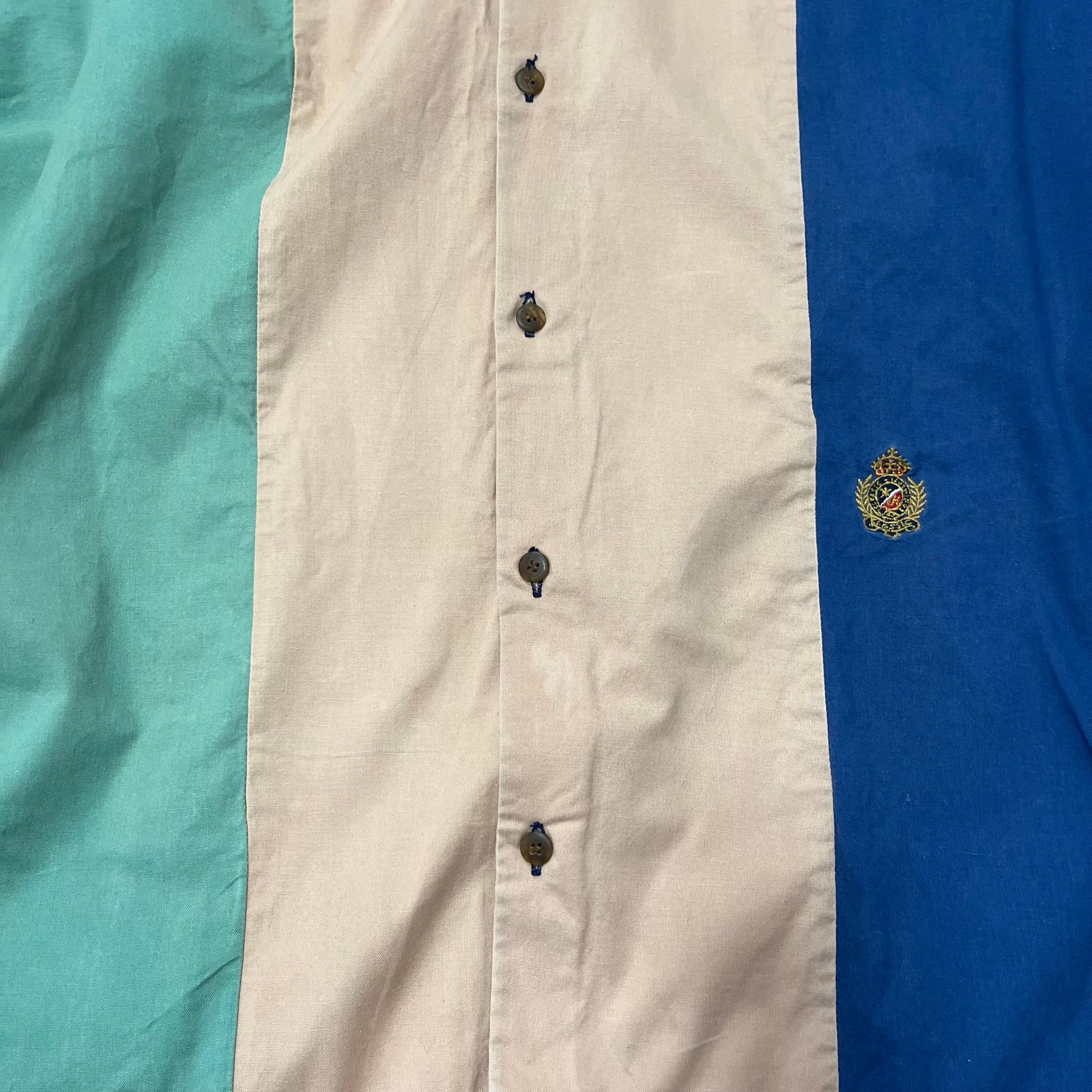 グリーン×ベージュ×ネイビーのトリコロール切り替えシャツ