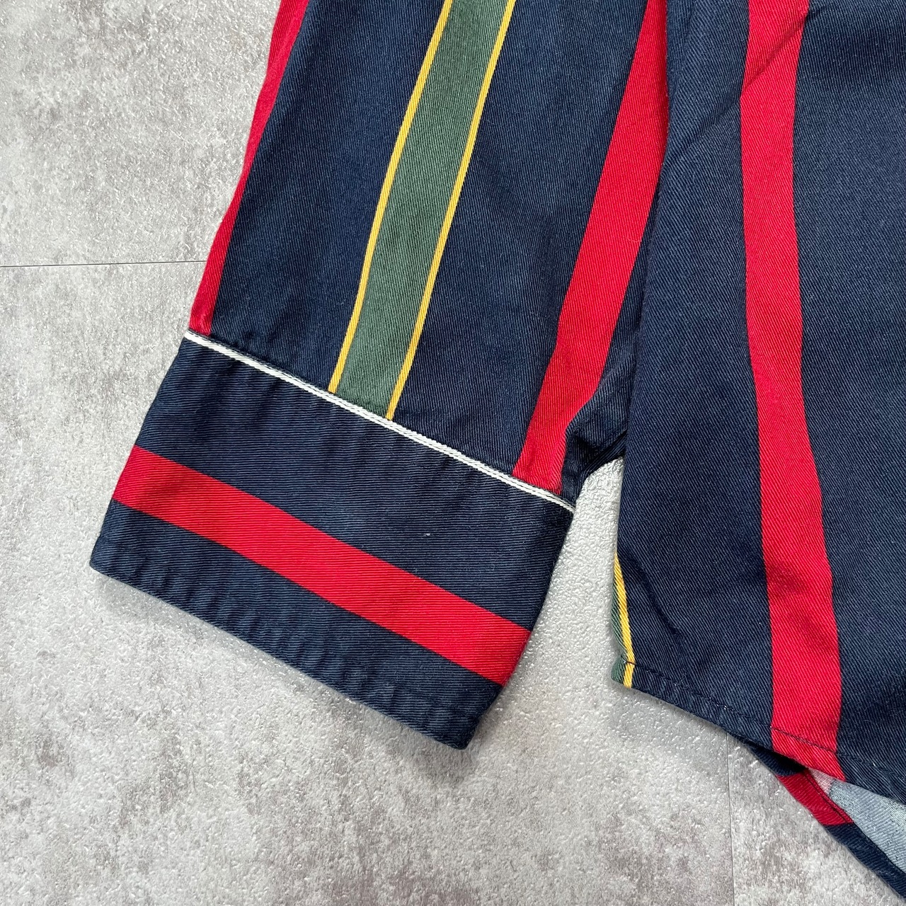 ネイビー・レッド・イエローのストライプが絶妙なコントラストを描く、トラッドスタイルの王道シャツ。どこか英国調の気品を感じさせつつ、カジュアルにも着こなせる万能な一枚です。