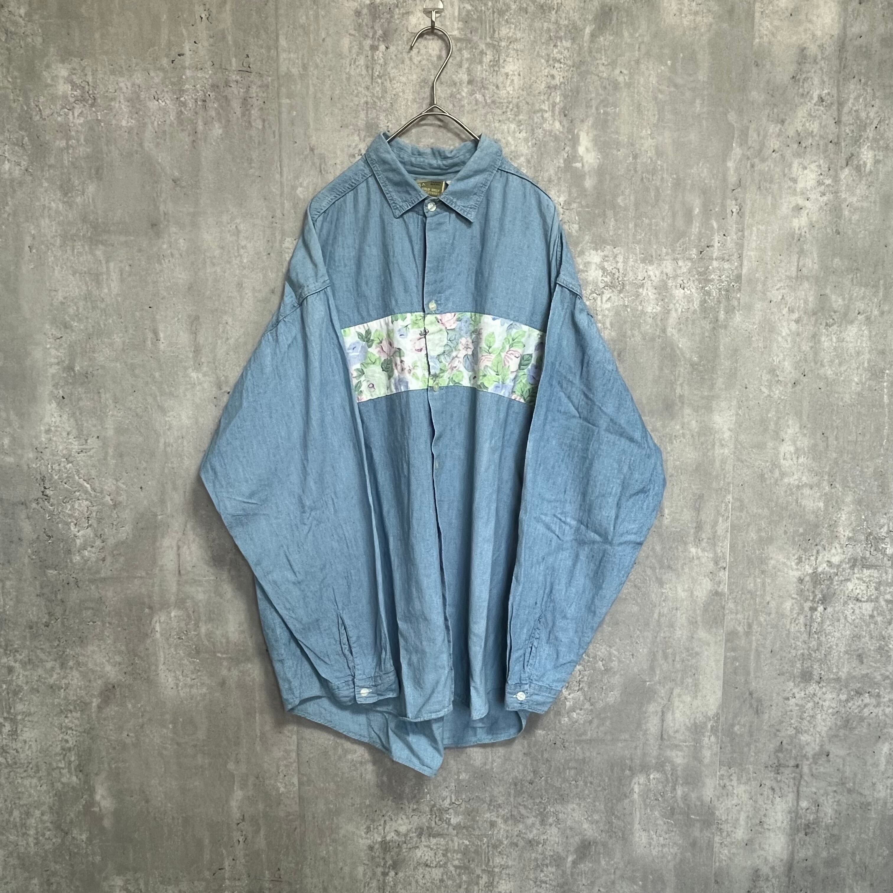 静けさの中に華やかさを秘めた、胸元フラワーパネルが映えるデニム風シャツ。
