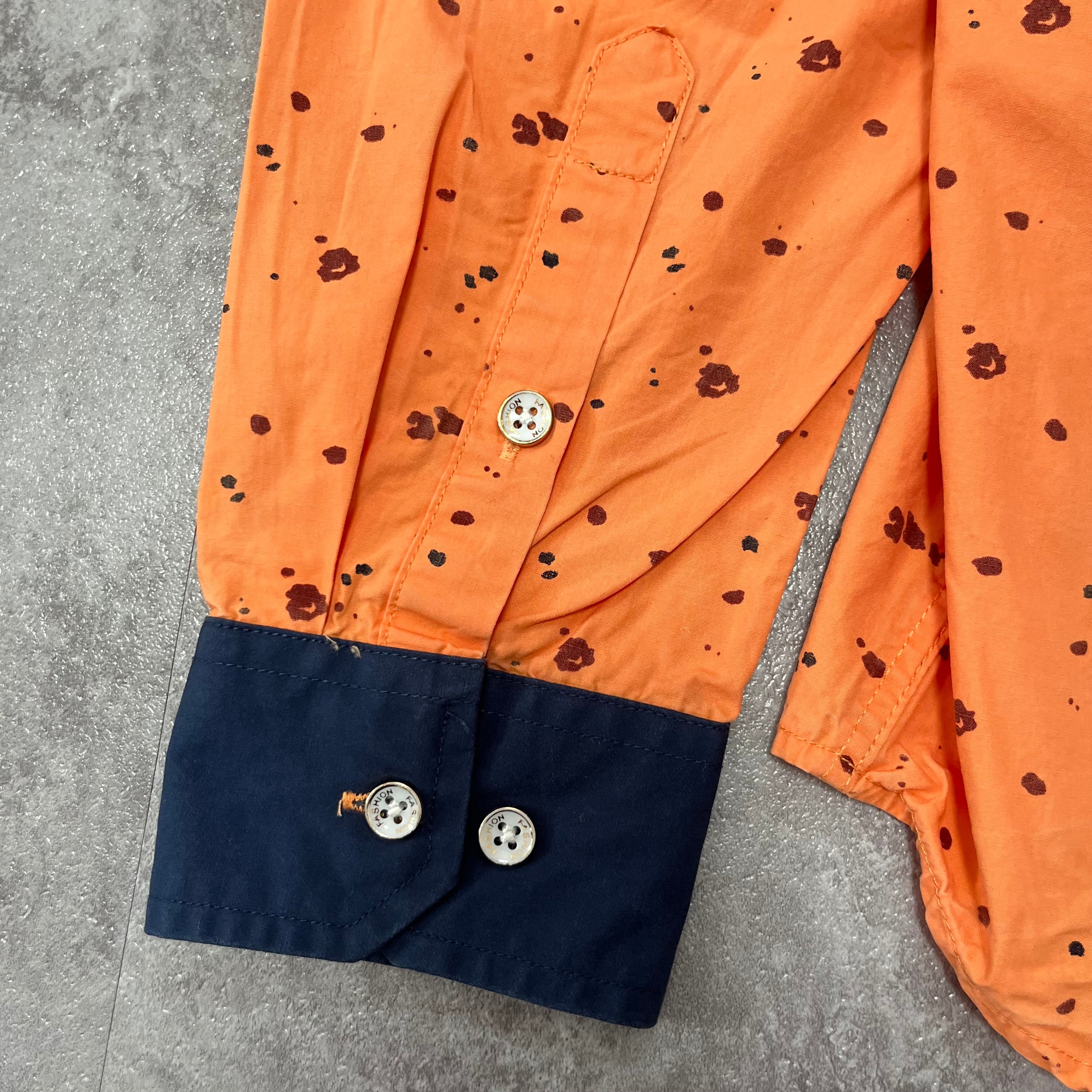 “遊び心のある配色デザイン オレンジ長袖シャツ”です。