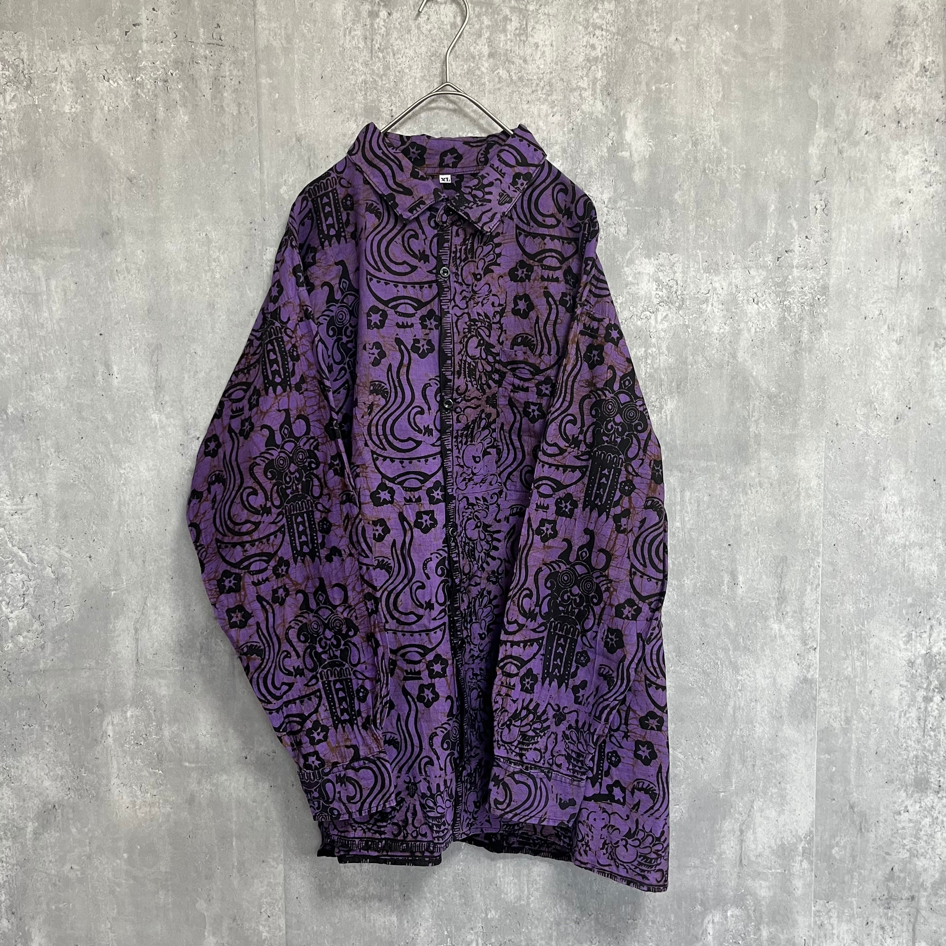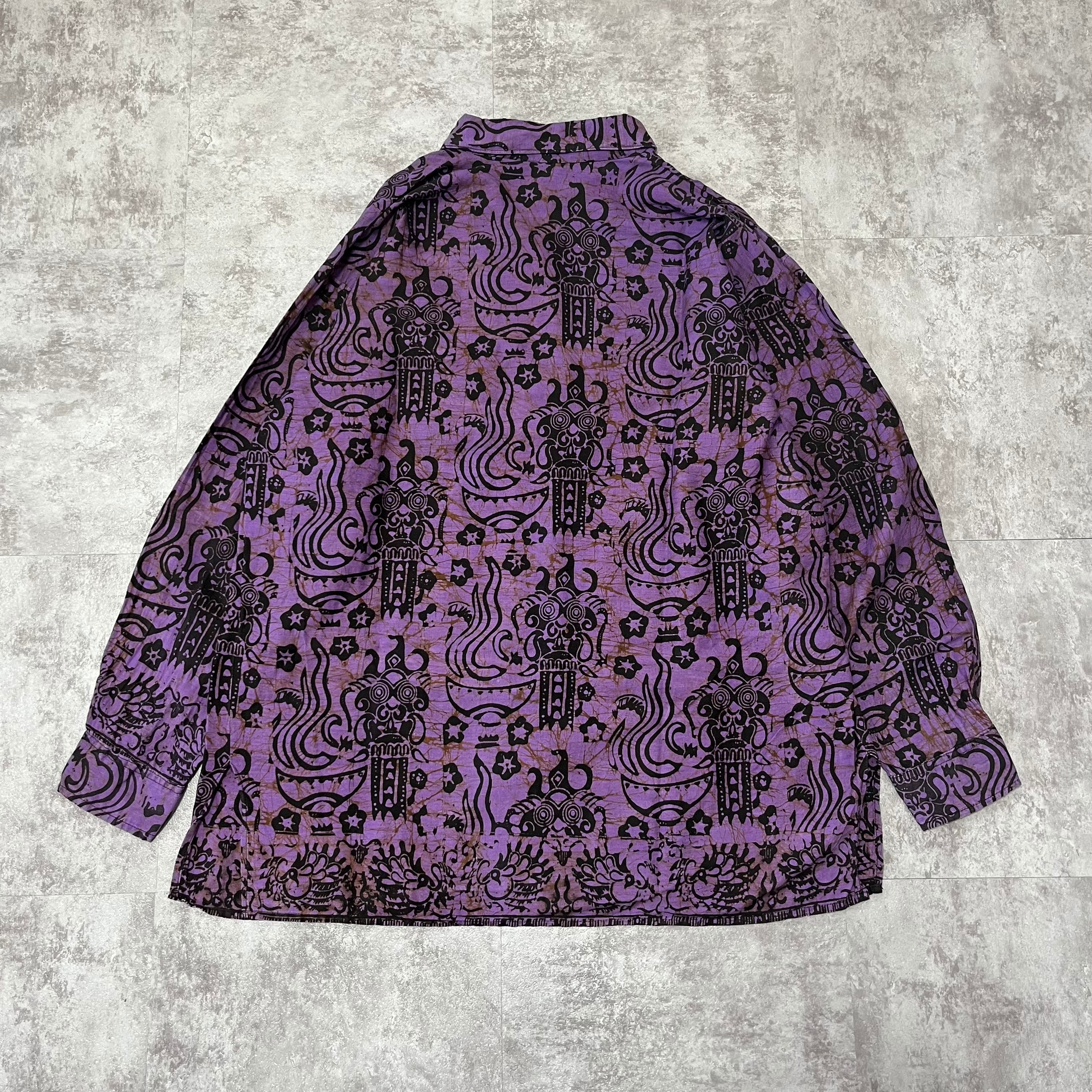 妖艶な紫に黒の模様が浮かび上がる、存在感抜群のエスニック柄シャツ。