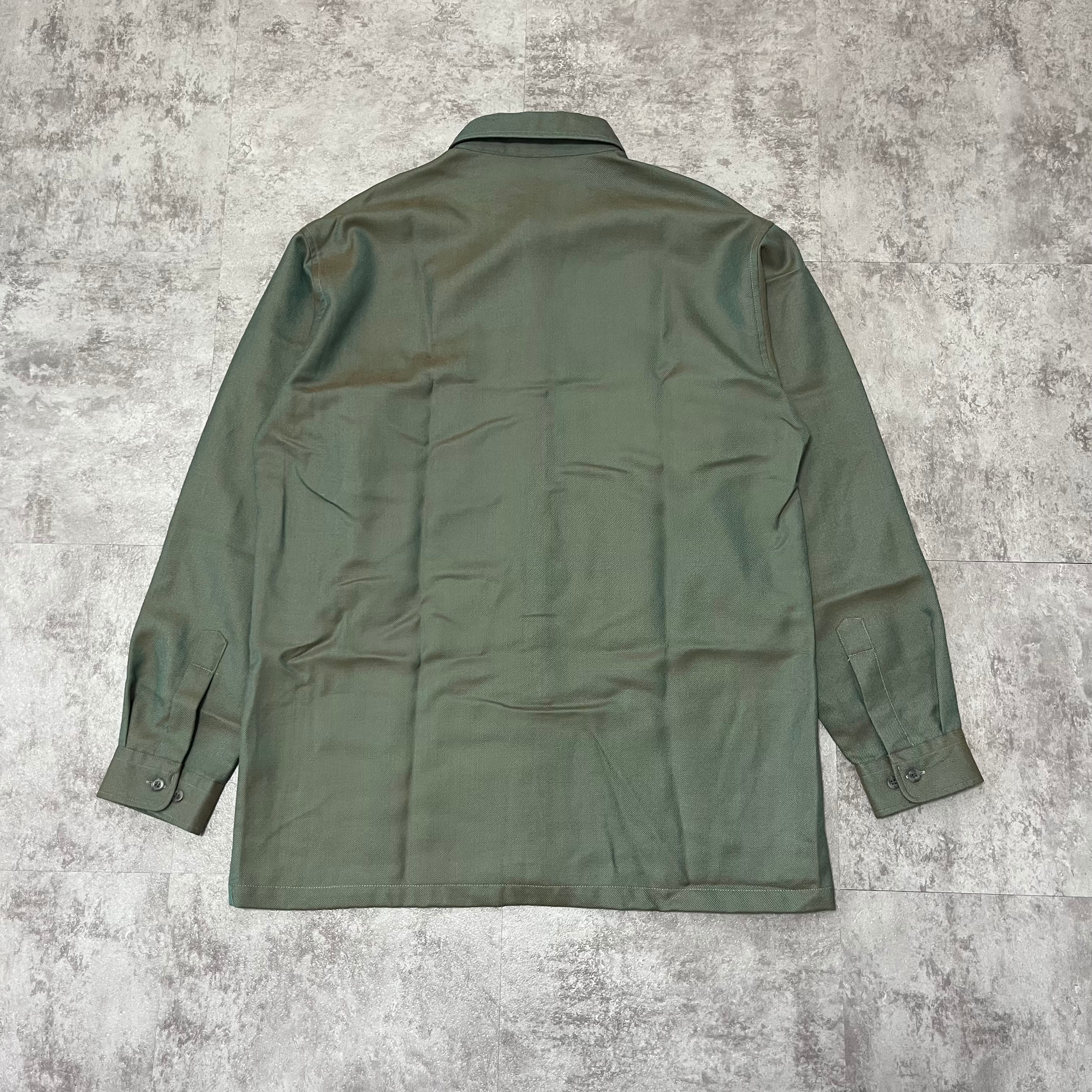 光沢感と奥行きのある色味が印象的な、メタリックカーキのウールドレープシャツ。