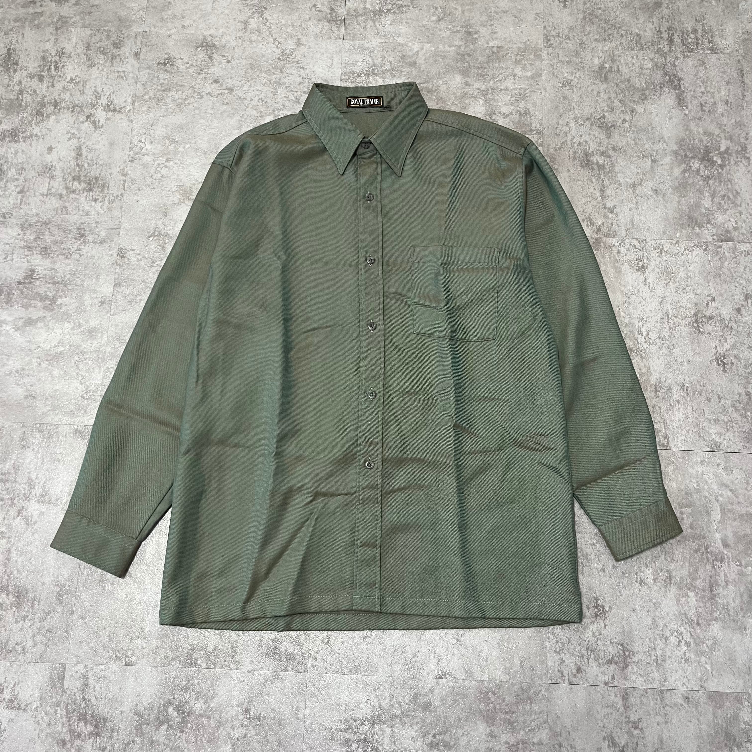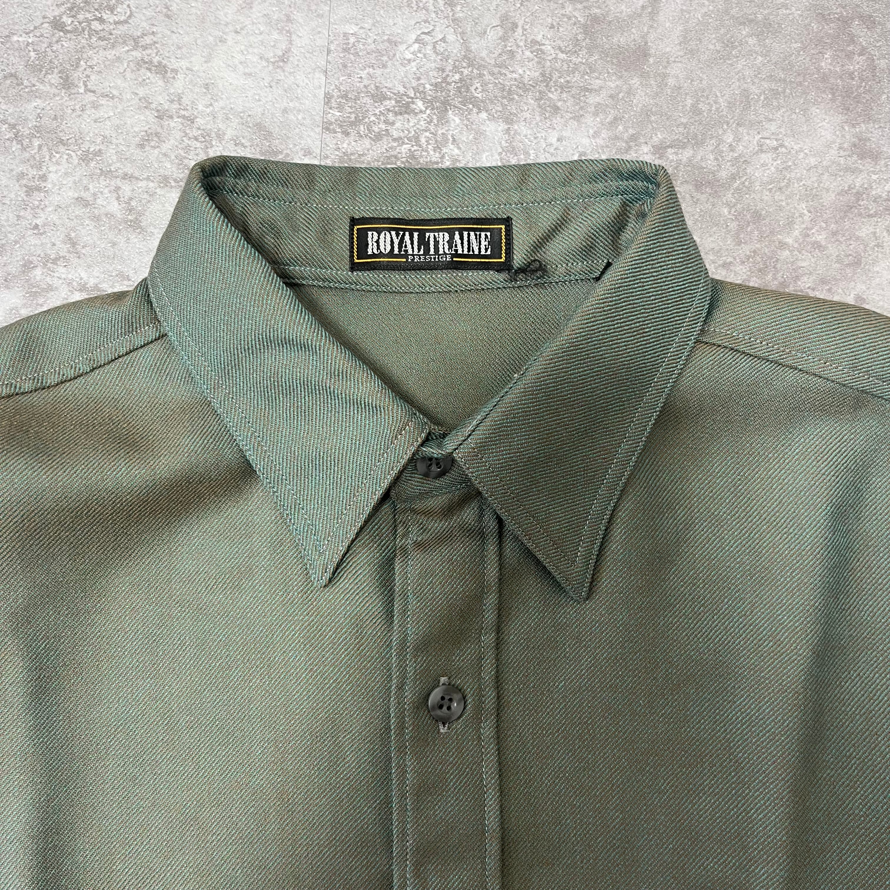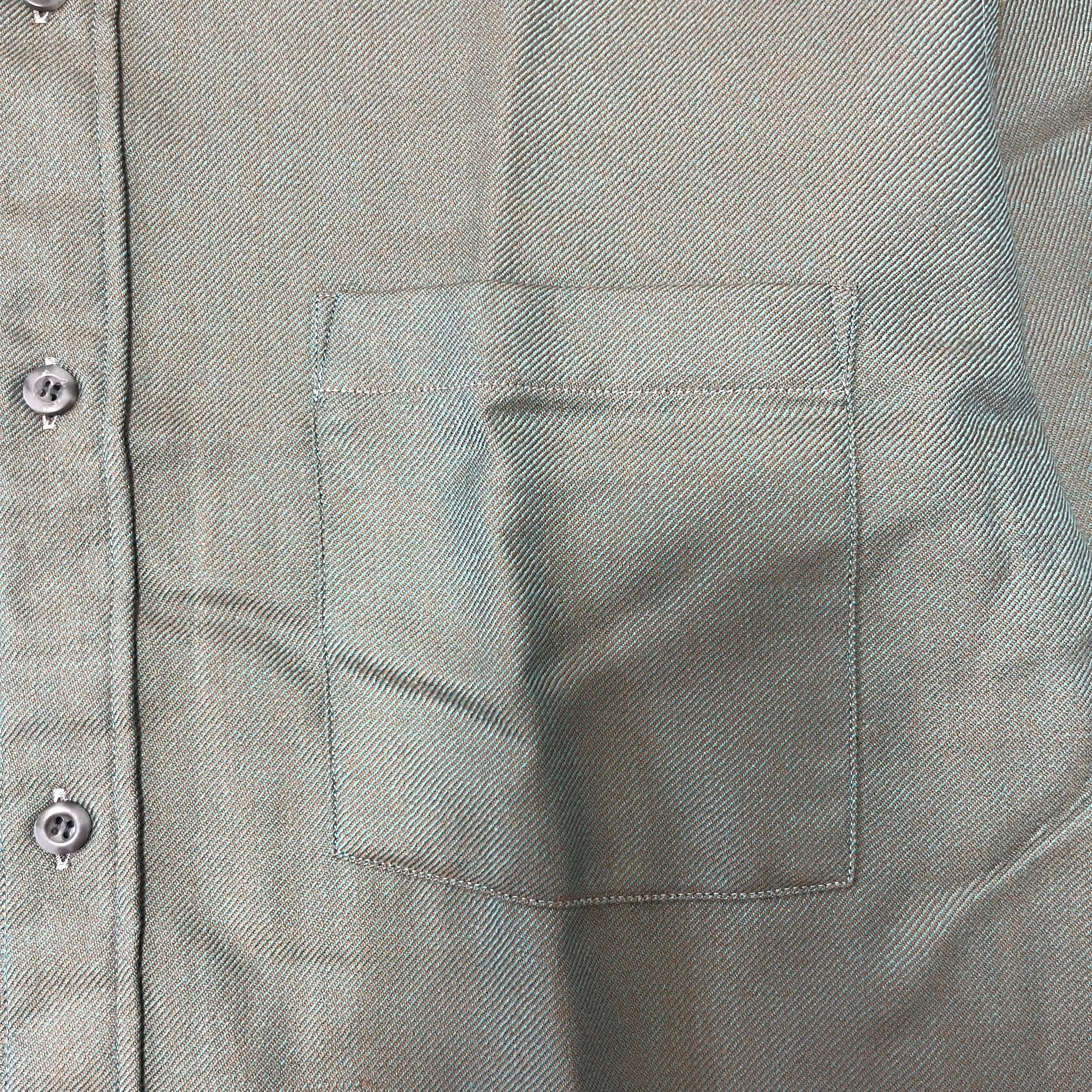 角度によって色が変わるメタリックカーキのプレミアムウールドレープシャツ