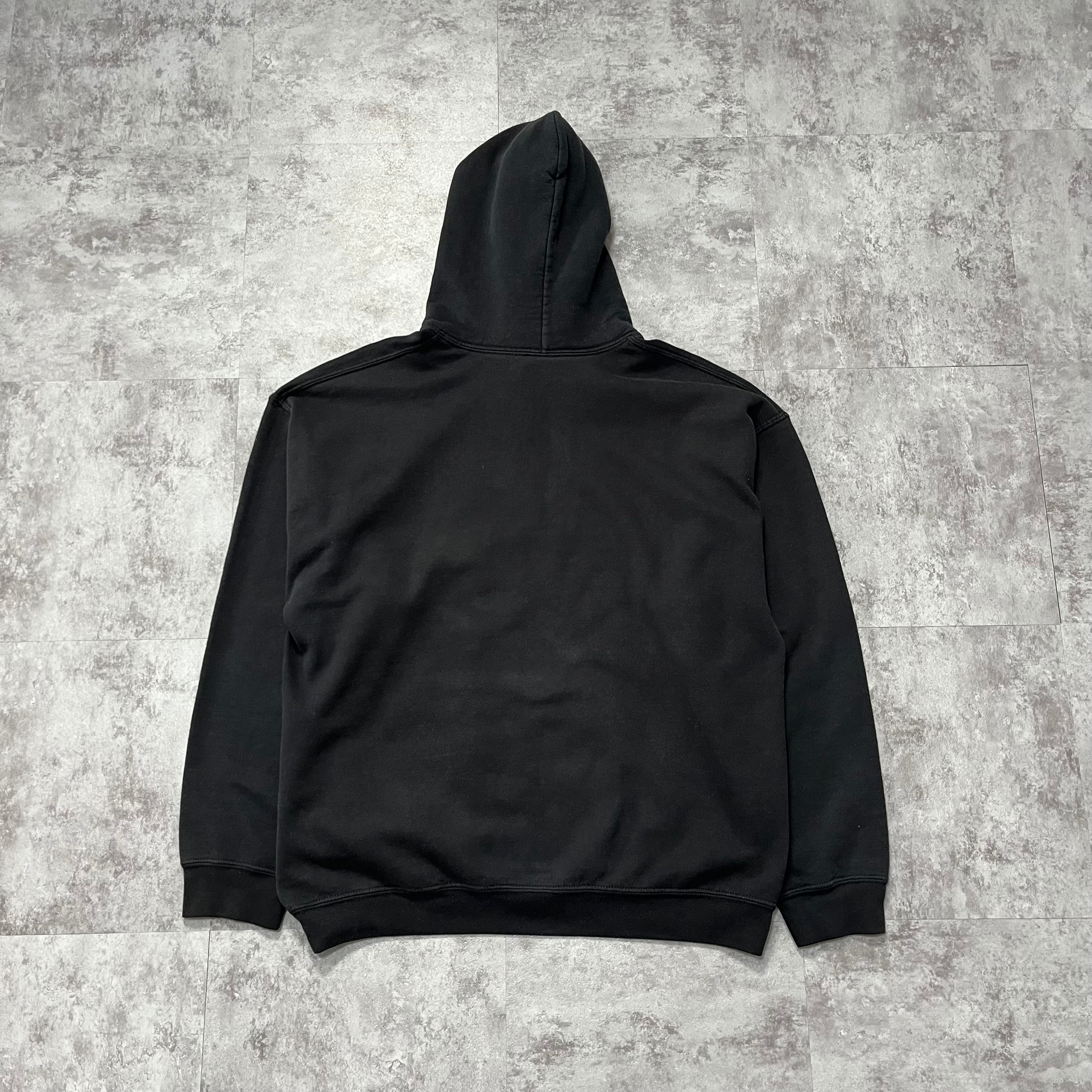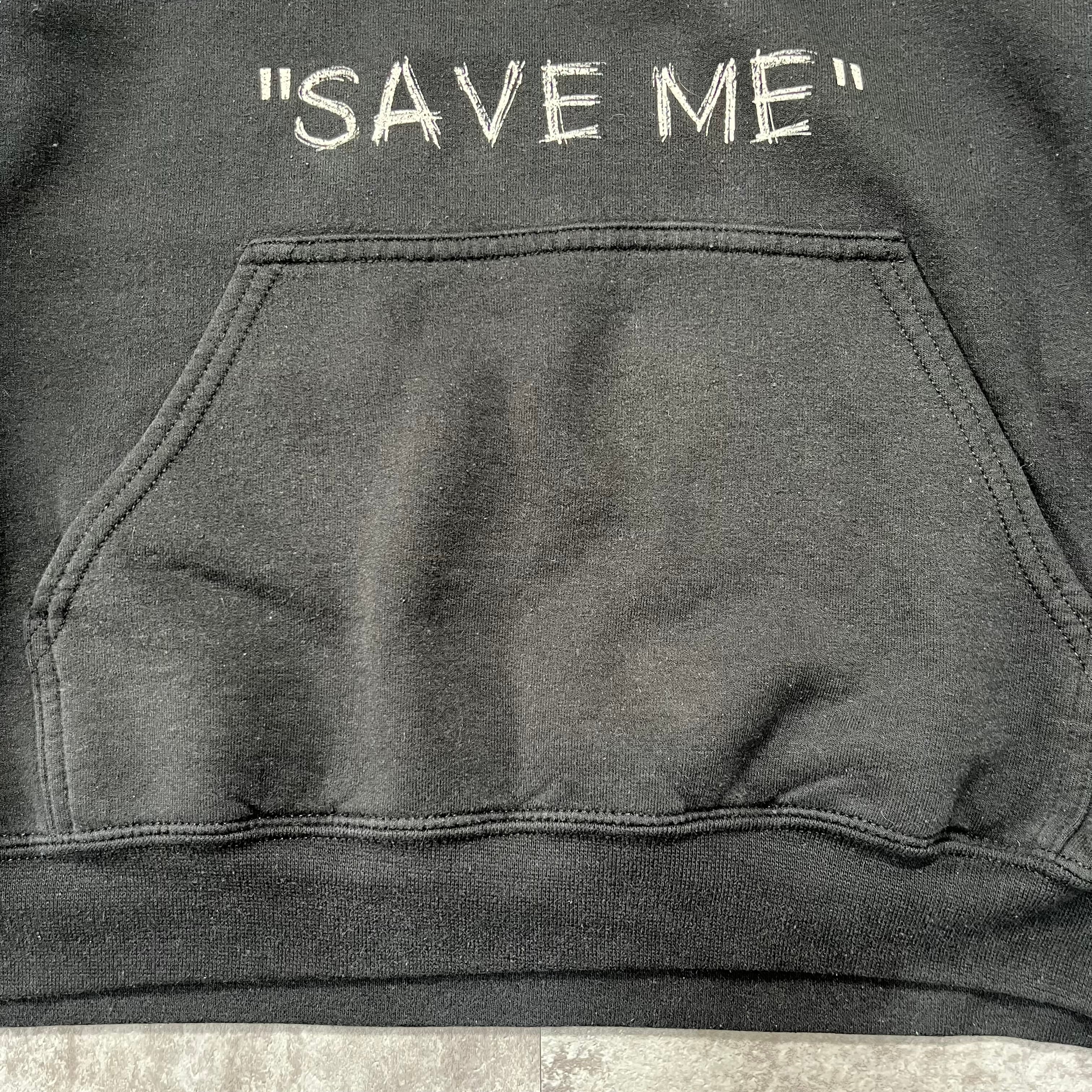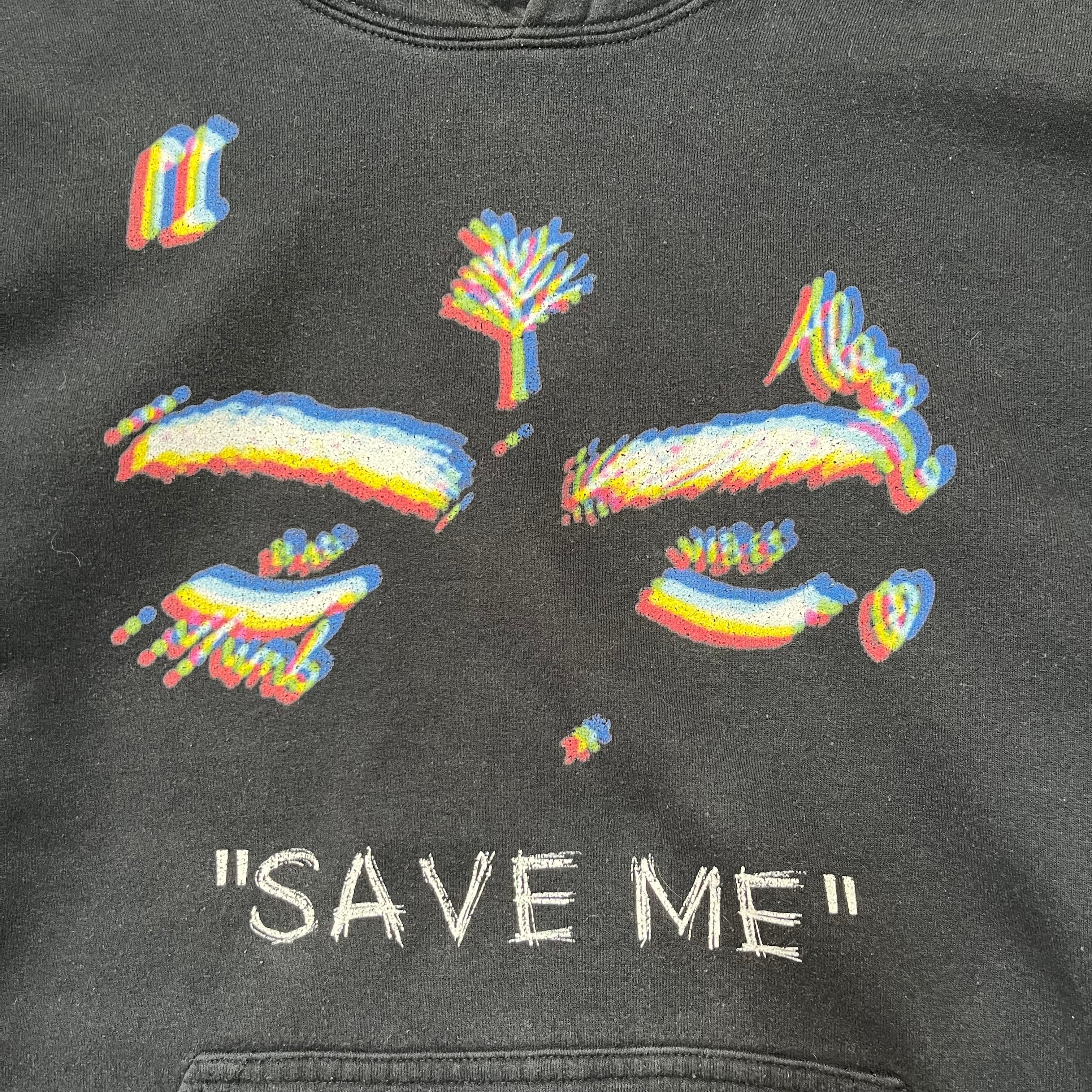3Dメガネいらずの立体プリントが視線を奪う、ブラックフーディ。フロントの「SAVE ME」ロゴと、浮かび上がるような目元のデザインがインパクト抜群です。モノトーンなのに存在感が強く、1枚でストリートとアートの中間を歩けるバランス。