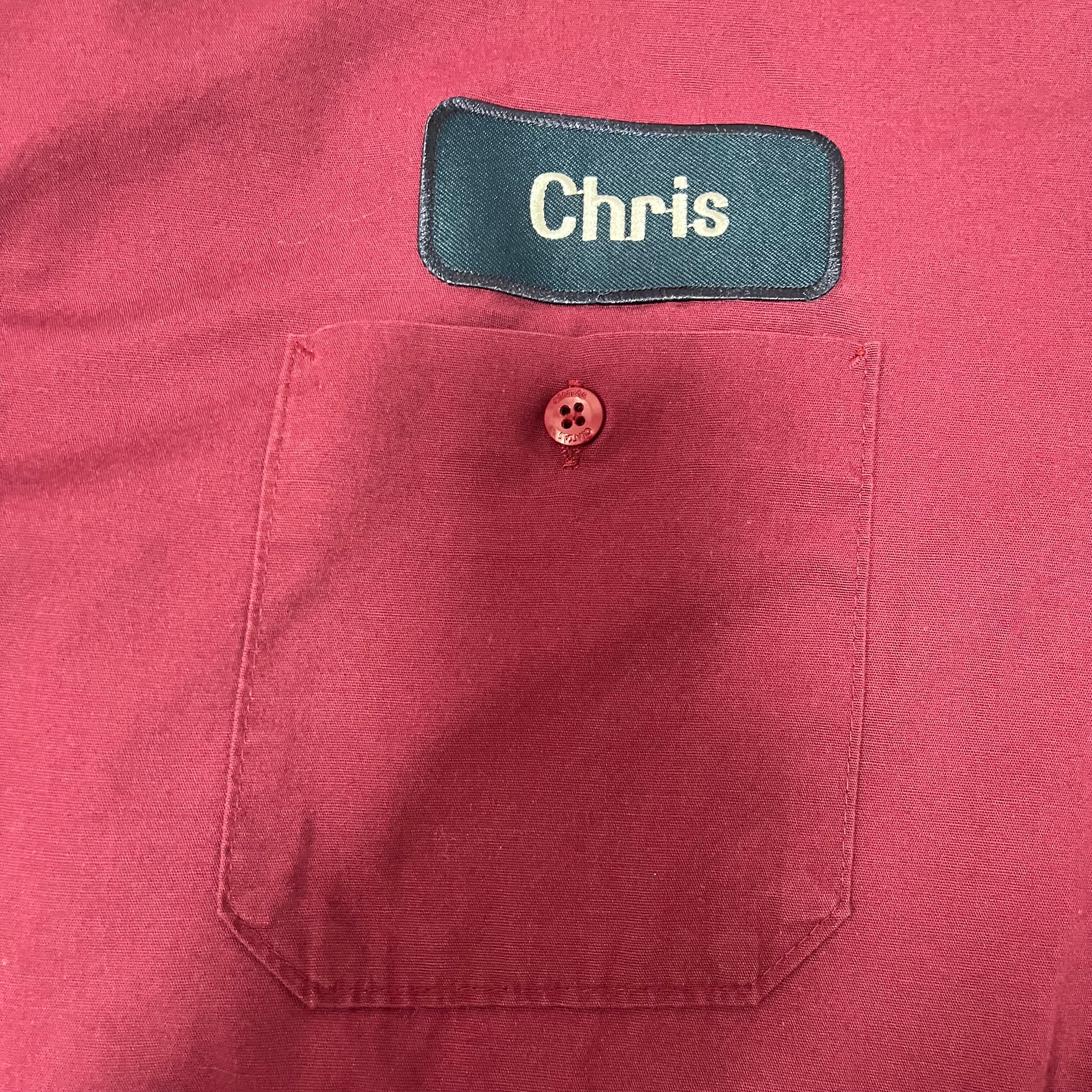 ワインレッドの深みある色合いが印象的で、胸元には「Chris」のネームパッチと企業ロゴのワッペンが施されたアメリカらしい一枚です。