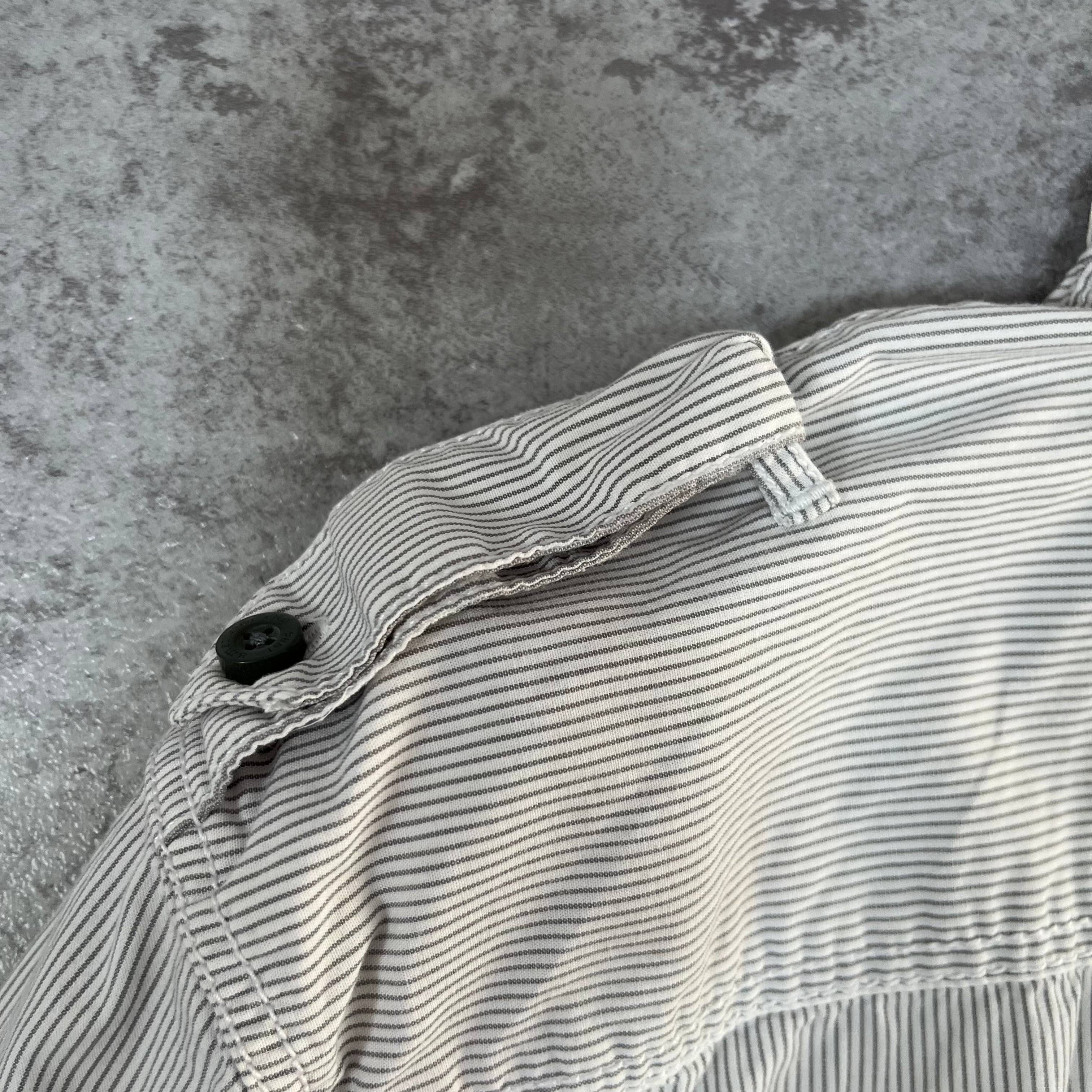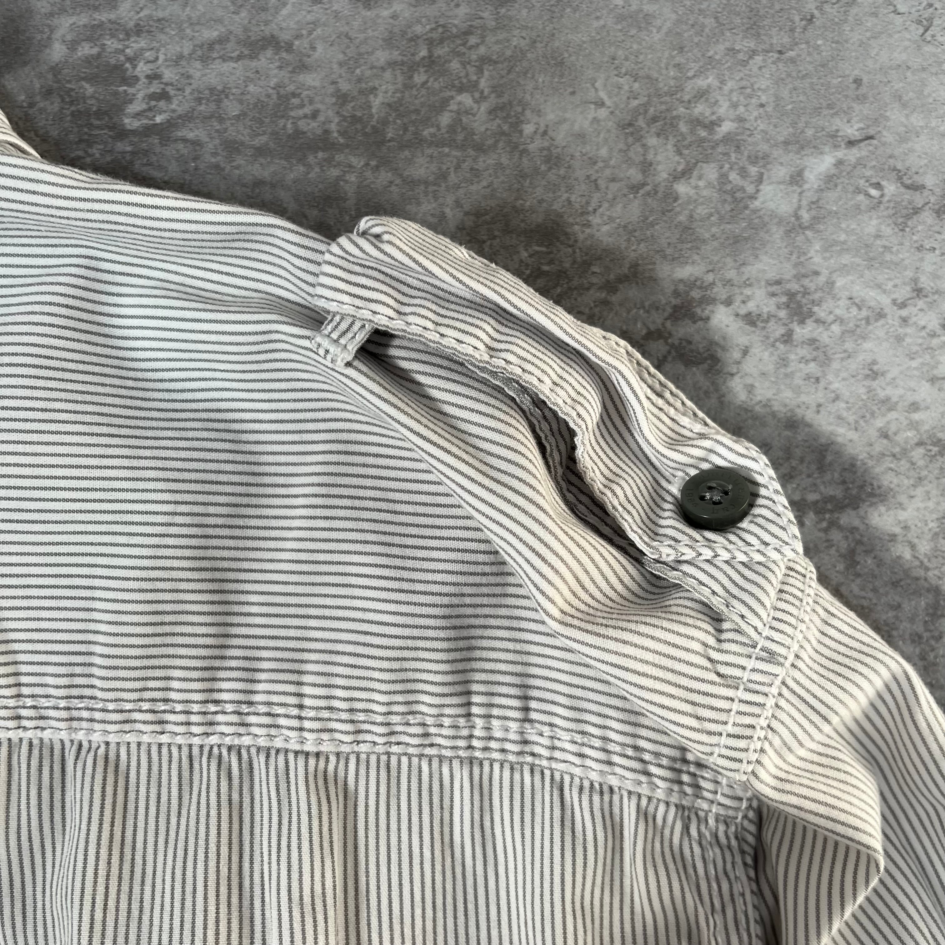 細かなピンストライプに加え、両胸のフラップポケットと肩のエポーレットが特徴的で、ワークとミリタリーの中間的なデザインバランスが魅力です。