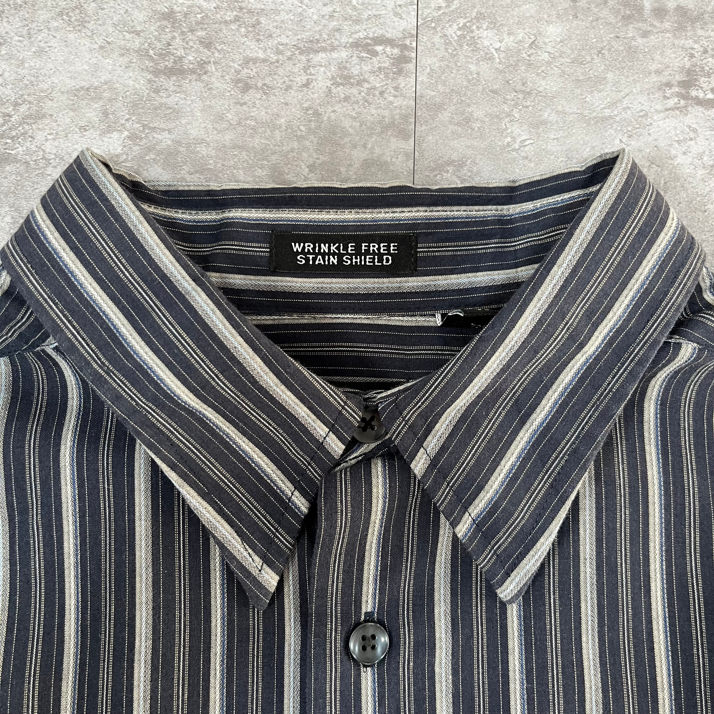 00s VAN HEUSEN Wrinkle Free Stain Shield グレーネイビーストライプシャツ XL